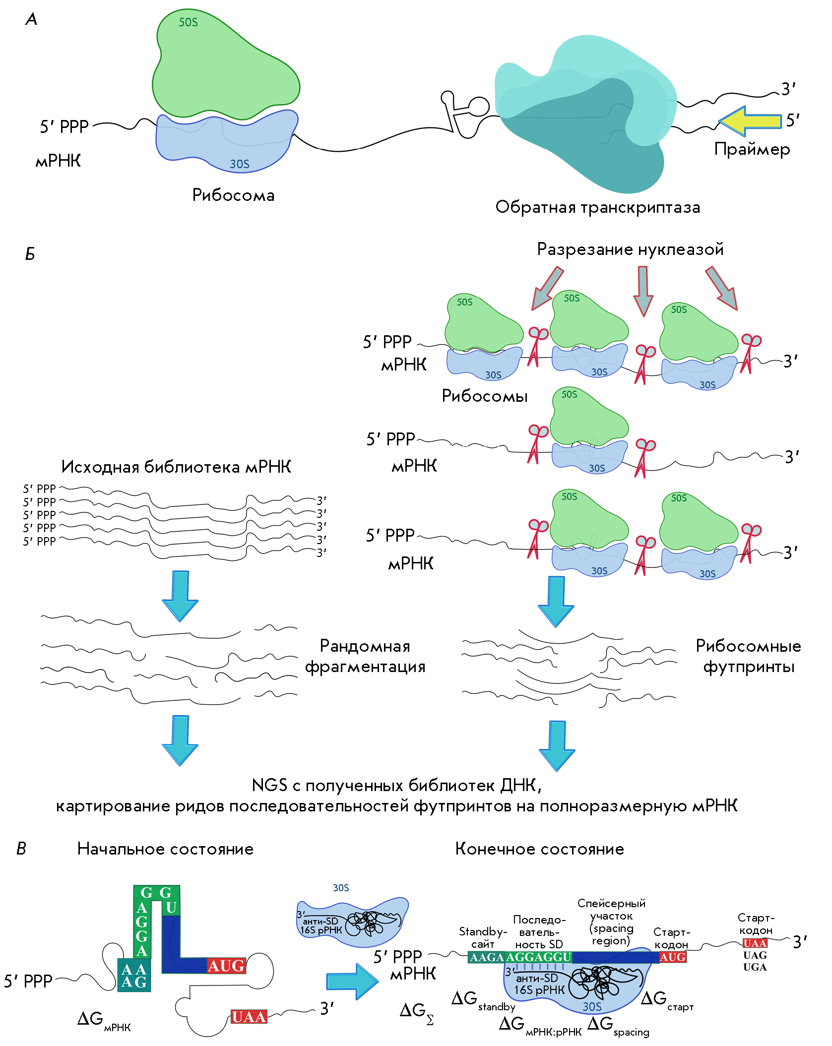 Fig. 2. (A) – The principle of the toeprinting technique. Stable ribosome complexes stop reverse transcriptase at a specific mRNA position, thus generating short cDNA products of a specific length. Primers for reverse transcriptase can be radioactively or fluorescently labeled. (B) – The scheme of the ribosome profiling method (Ribo-seq). After translation initiation, mRNA is cut by a specific nuclease at the sites where it is not protected by ribosomes. In parallel, the original mRNA library is prepared for sequencing by random fragmentation. It will be used as a reference sequence. All obtained ribosome footprints are used to prepare a DNA library, which is further deeply sequenced. Based on the NGS results, footprint sequence reads are mapped to full-length mRNA. (C) – The thermodynamic model of bacterial translation initiation. Changes in free energy during the initiation stage depend on the five types of molecular interactions defining the initial and the final states of the system. The drawing was executed in the Inkscape software