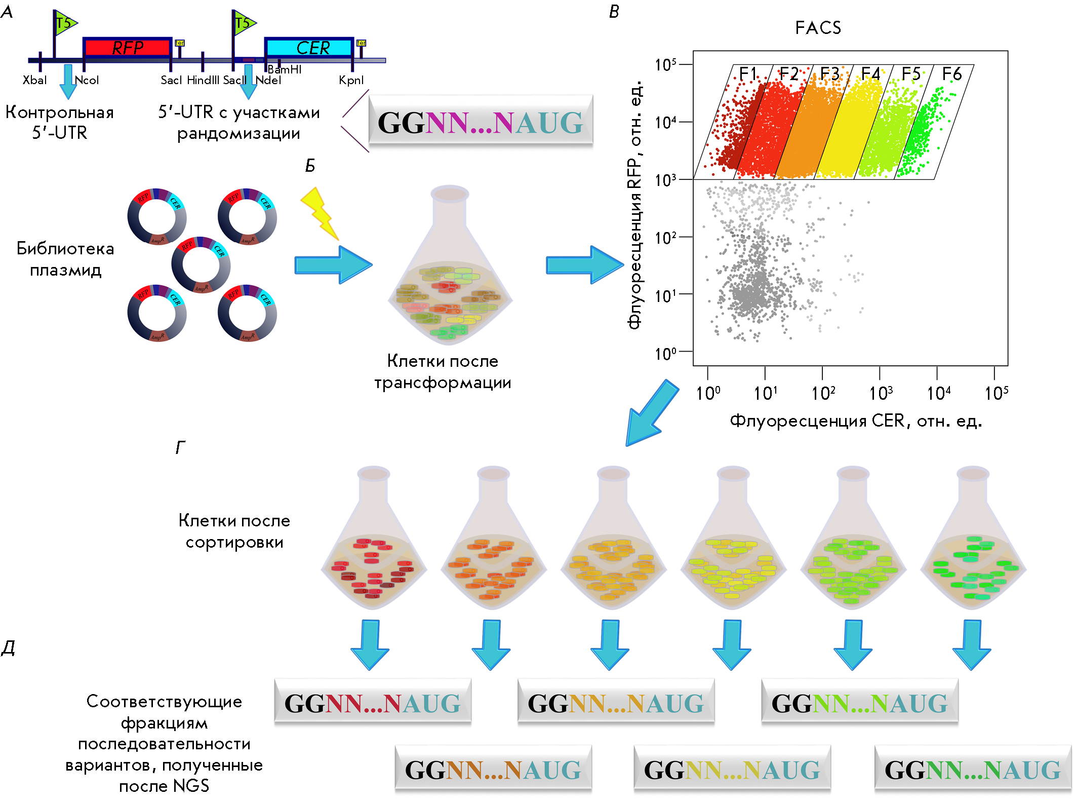 Fig. 3. The scheme of the Flow-seq method (as exemplified by working with randomized 5’ UTR upstream of the CER protein gene and control 5’ UTR upstream of the RFP protein gene). The stages of plasmid library construction, transformation, sorting, and sequencing are presented. (A) – Cloning of a randomized DNA fragment into a reporter vector upstream of the CER protein gene. A constant 5’ UTR is retained upstream of the RFP protein gene. (B) – Electroporation of the entire plasmid library into E. coli cells. (C) – Cell separation based on the CER/RFP fluorescence intensity ratio by a cell sorter. (D) – Cell fraction collection (e.g., F1–F6) according to the CER/RFP ratio. (E) – DNA isolation and randomized region amplification followed by high-throughput sequencing (NGS). The drawing was executed in the Inkscape software