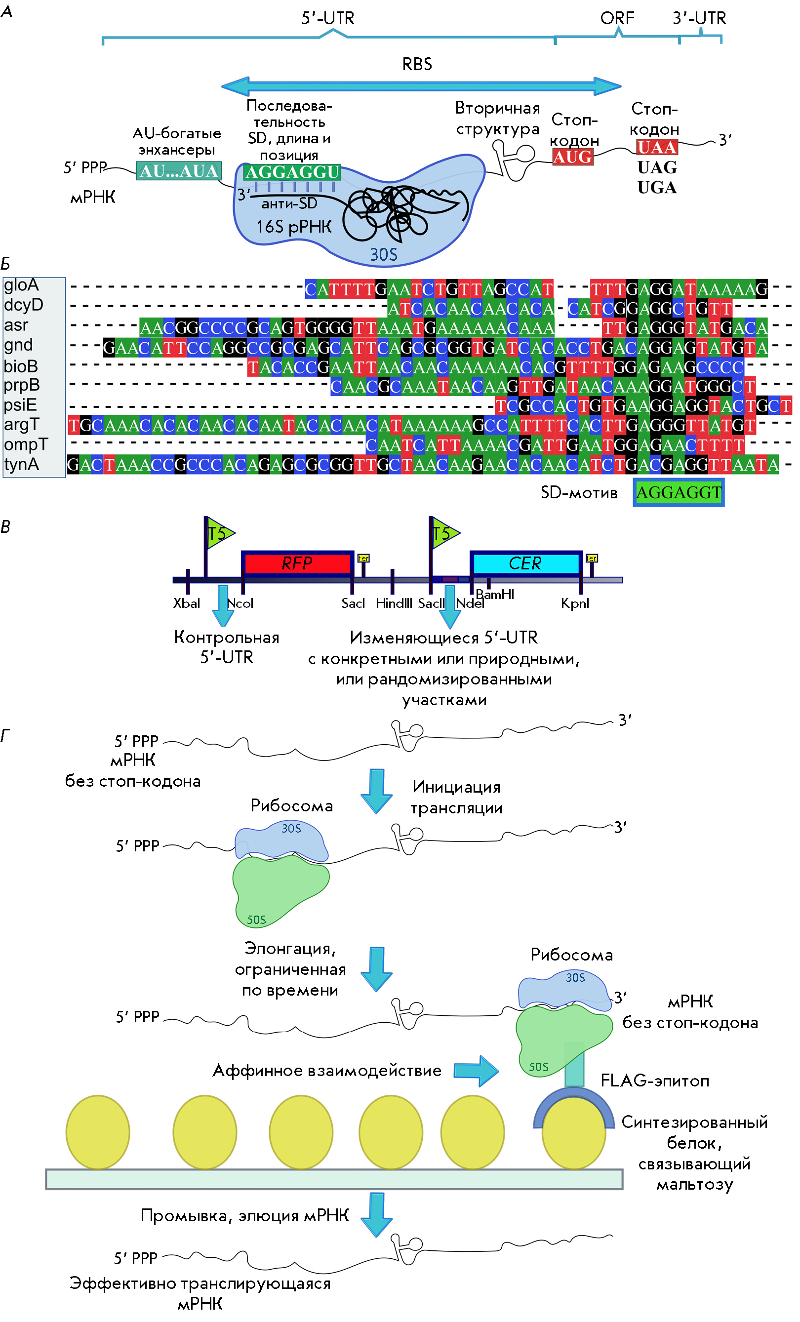 Рис. 1. А – особенности строения мРНК у бактерий. 5’- и 3’-UTR, 5’- и 3’-нетранслируемые области соответственно. RBS – сайт посадки рибосомы. ORF – открытая рамка считывания, содержащая белоккодирующую последовательность. SD и анти-SD – последовательности Шайна–Дальгарно и анти-Шайна–Дальгарно соответственно. Б – пример выравнивания последовательностей 5’-UTR мРНК, используемого при широкомасштабном анализе нетранслируемых областей генов с выделением SD-мотива. В – пример двойной репортерной конструкции с контрольной 5’-UTR перед геном флуоресцентного белка RFP и изменяющейся 5’-UTR перед геном второго флуоресцентного сенсорного белка CER для оценки влияния особенностей вариабельного участка на эффективность трансляции. Г – схема аффинного выделения рибосом с эффективно транслирующейся мРНК. Отбор проводился лимитированием времени in vitro трансляции. мРНК содержит 5’-UTR, кодирующую область, включающую участок, кодирующий FLAG-эпитоп, который взаимодействует с синтезируемым белком, связывающим мальтозу, и TolA, который позволяет эпитопу выйти из рибосомного туннеля и правильно свернуться. В конструкции нет стоп-кодона, поэтому рибосома остается на мРНК. Рисунок выполнен в программе Inkscape