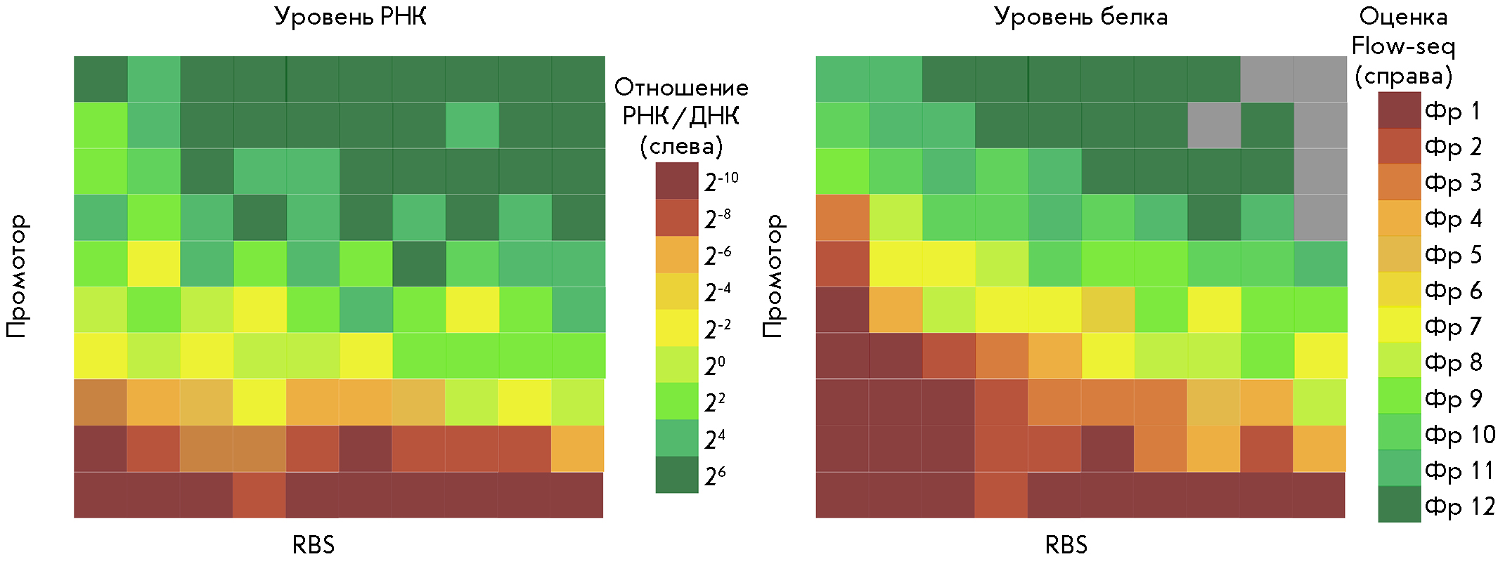 Рис. 4. Схематическое изображение примерных репрезентативных карт уровней эффективности синтеза РНК и белка. Уровни РНК (слева) и белка (справа) для небольшого набора конструкций размещены на сетке согласно идентичности промоторов (ось Y) и сайтов посадки рибосом (RBS, ось Х). Промоторы и RBS отсортированы по возрастанию средних значений эффективности синтеза РНК и белка соответственно. Серые клетки указывают на конструкции, соответствующие уровням, лежащим ниже эмпирически заданного порога. Шкалы уровней РНК (отношения РНК к ДНК) и белка (отношения флуоресценции белков GFP (зеленый) к RFP (красный)) показаны справа от соответствующих им карт. Рисунок выполнен, опираясь на источник [67], в программе Inkscape