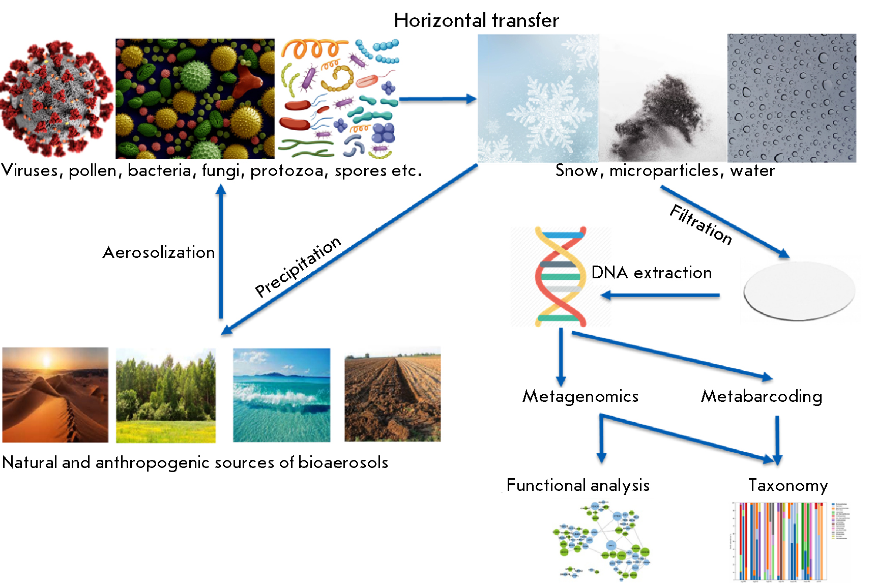 Microorganisms are found ubiquitously in the environment and play a crucial role in almost all ecosystems [1]. Since many pathogens spread through the airborne route, including the SARS-CoV-2 coronavirus that has caused the current COVID-19 pandemic, it is especially relevant to study, monitor, and control the composition of outdoor and indoor air [2, 3]. Much data have been gained about the correlation between outdoor air pollution and the more severe course of COVID-19: for example, in India, a lower mortality rate from COVID-19 was observed in cities with better air quality [4]. We would like to emphasize that the term “bioaerosol” covers a broad range of particulate organic matter contained in the atmosphere, originating from various living and dead organisms [5]. Along with particulate matter of microbial, plant, or animal origin, bioaerosols usually also contain a broad range of antigenic compounds, microbial toxins, and viruses [6, 7]. Understanding the processes of bioaerosol formation, their distribution patterns, migration, structure, etc., especially under the harsh conditions of the upper atmosphere, is required for many fundamental and applied scientific disciplines [8], such as physics, chemistry, meteorology, and atmospheric hydrology; research into the content of allergy-inducing particles and microorganisms pathogenic to humans, farm animals, and plants; as well as aerobiology, biogeography, biodiversity, and general ecology. The key trends in bioaerosol research include (a) assessment of their sources and flows, (b) spatial distribution and its changes over time, (c) aging of biological particles, (d) metabolic activity, (e) urbanization of allergies, (f) pathogen transport, and (g) the impact on climate [8].