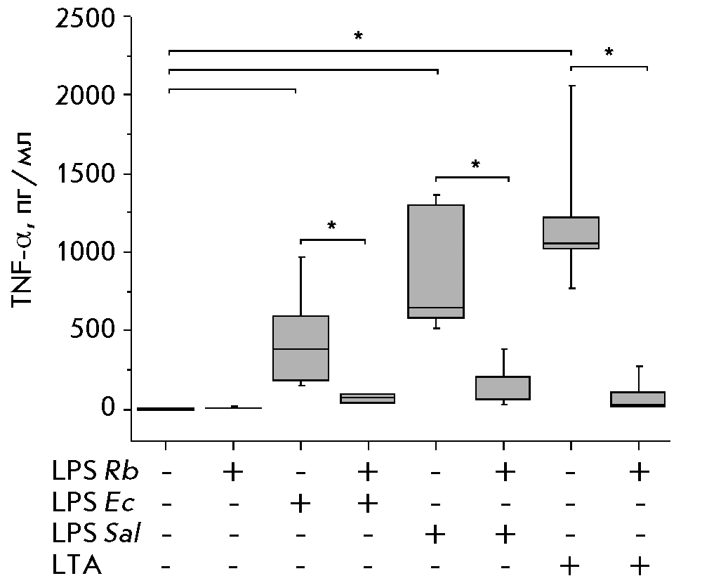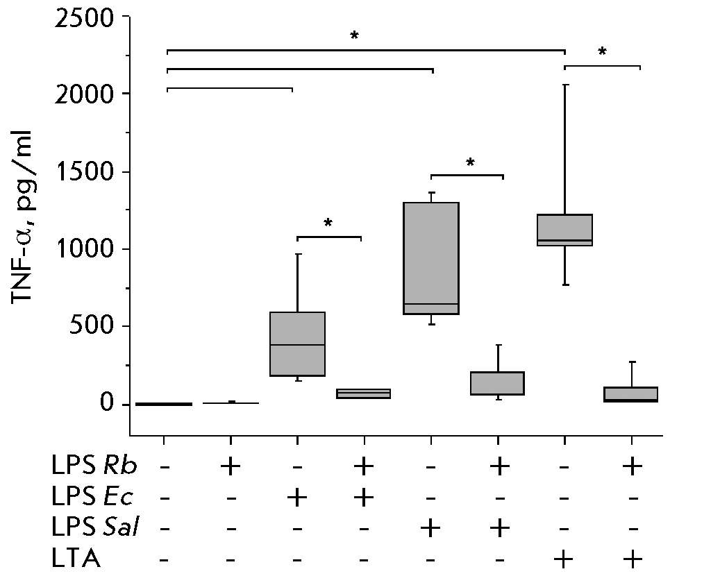 Рис. 1. Влияние LPS Rhodobacter capsulatus PG на секрецию TNF-α при активации клеток крови LPS E. coli, LPS Salmonella enterica или LTA Streptococcus pyogenes, n = 7. *р < 0.05
