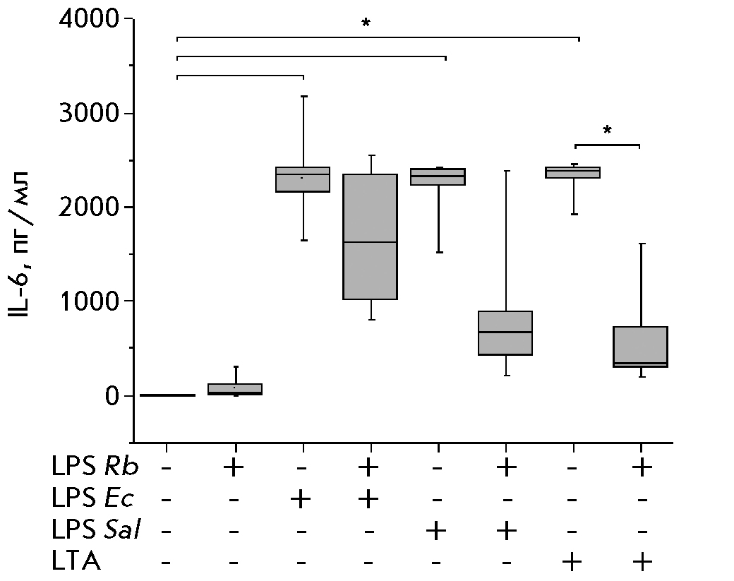 Рис. 2. Влияние LPS Rhodobacter capsulatus PG на секрецию IL-6 при активации клеток крови LPS E. coli, LPS Salmonella enterica или LTA Streptococcus pyogenes, n = 7. *р < 0.05