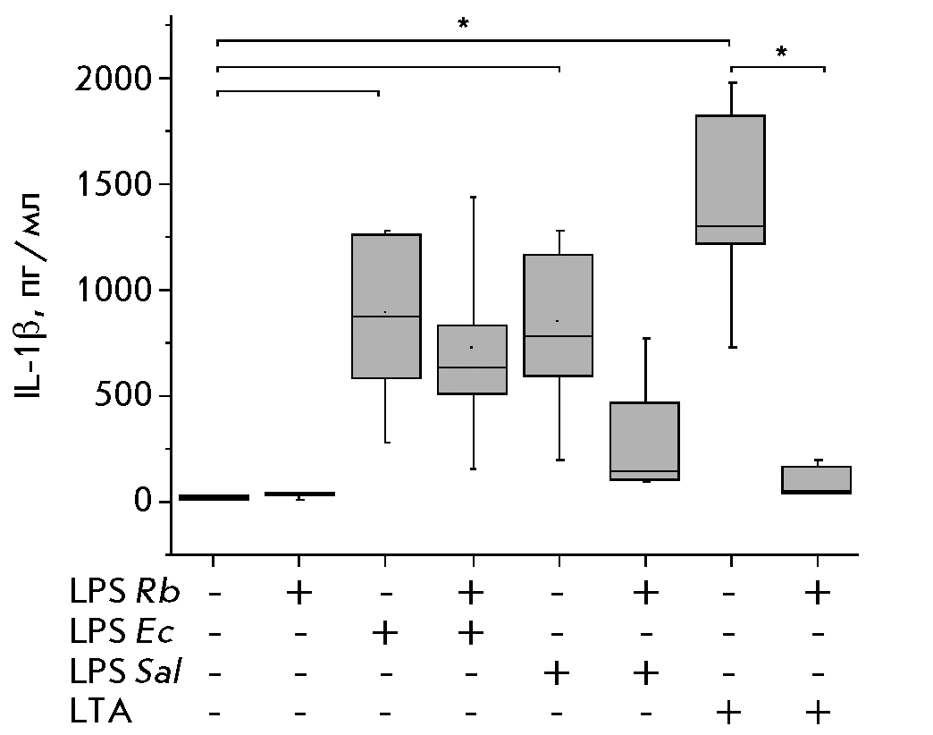 Рис. 3. Влияние LPS Rhodobacter capsulatus PG на секрецию IL-1β при активации клеток крови LPS E. coli, LPS Salmonella enterica или LTA Streptococcus pyogenes, n = 7. *р < 0.05