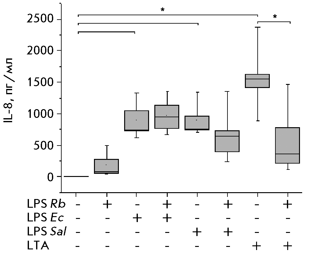 Рис. 4. Влияние LPS Rhodobacter capsulatus PG на секрецию IL-8 при активации клеток крови LPS E. coli, LPS Salmonella enterica или LTA Streptococcus pyogenes, n = 7. *р < 0.05