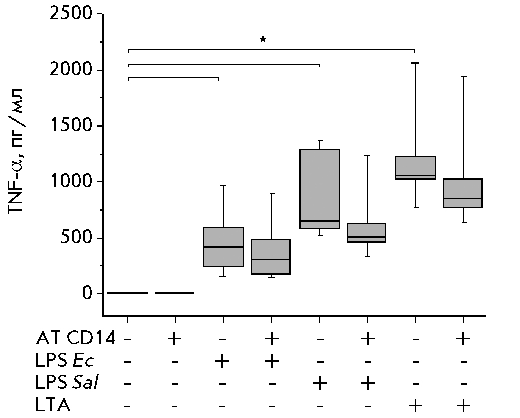 В контрольных образцах АТ к CD14 не влияли на активацию синтеза TNF-α в клетках крови (рис. 5). Предварительная инкубация крови с АТ к CD14 при последующей активации клеток LPS E. coli, LPS S. enterica или LTA S. pyogenes более заметно снижала синтез TNF-α, индуцированный LTA, чем эндотоксинами.