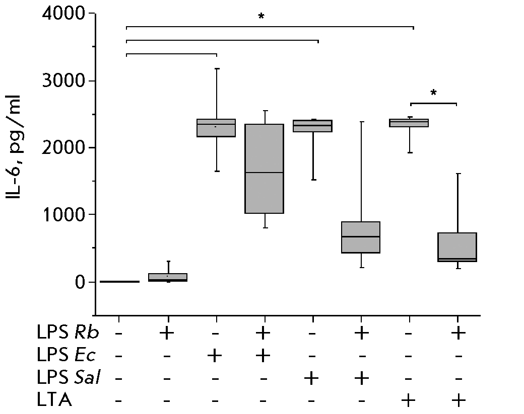 Fig. 2. Effect of R. capsulatus PG LPS on IL-6 secretion upon activation of blood cells by E. coli LPS, S. enterica LPS, or S. piogenes LTA, n = 7. *p < 0.05
