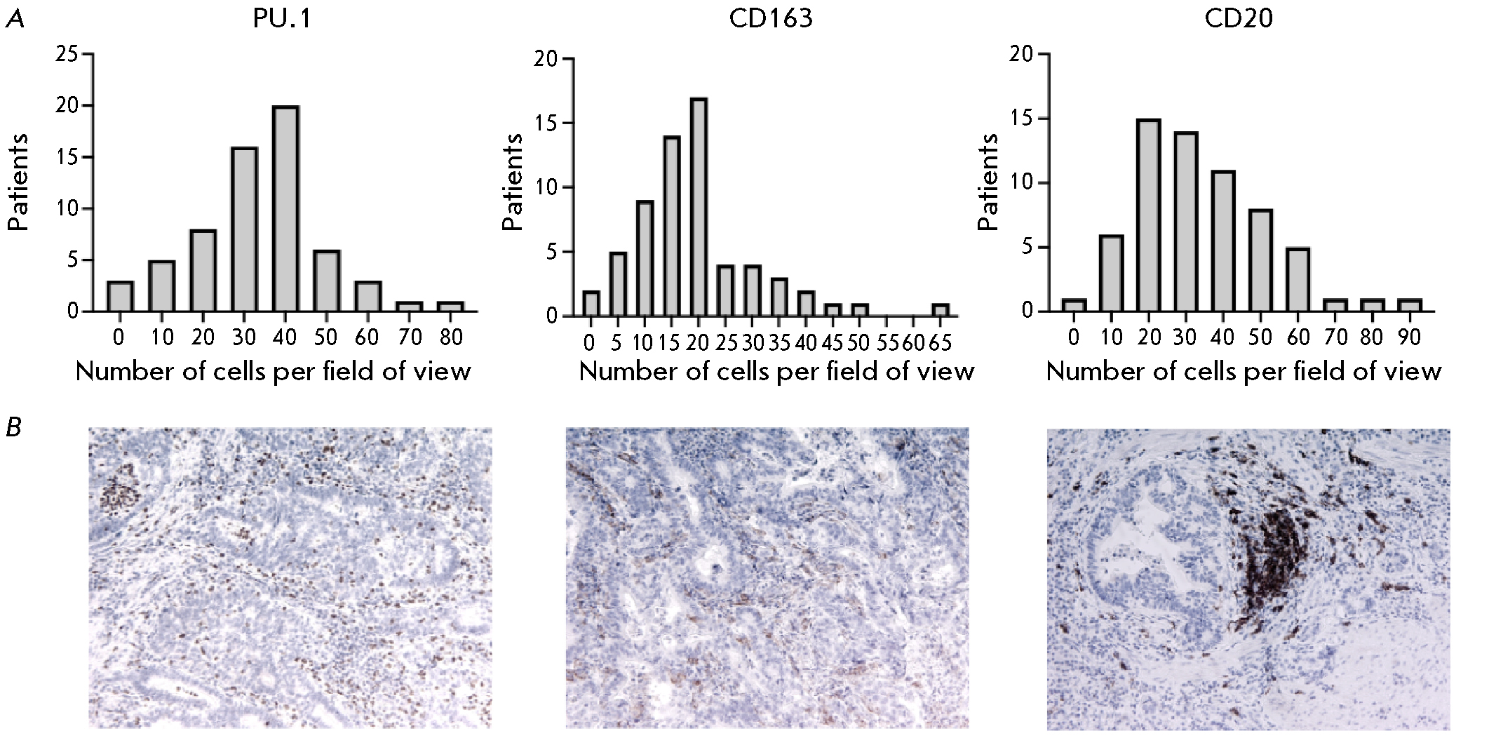 The analysis of the results showed that the median number of PU.1+ cells in the sample was 34.8 (0.4–77.8) cells per field of view, CD163+ cells – 17.6 (0.8–66.4), CD20+ cells – 32.2 (3.2–91.2). It should be noted that, in gastric tumors, B-cells are present in similar numbers as PU.1+ macrophages.