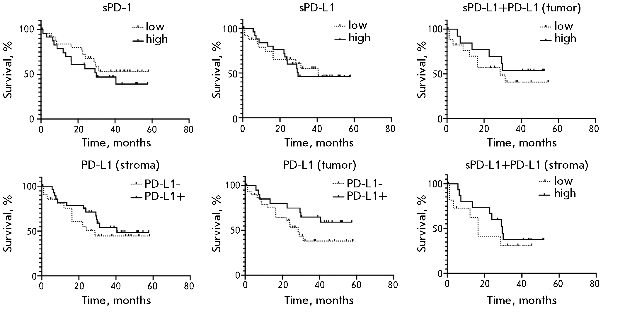 Fig. 4. Analysis of the overall survival of GC patients depending on the content of soluble (sPD-L1, sPD-1) and tissue (PD-L1, PD-1) forms of the main components of the PD-1/PD-L1 immunity checkpoint