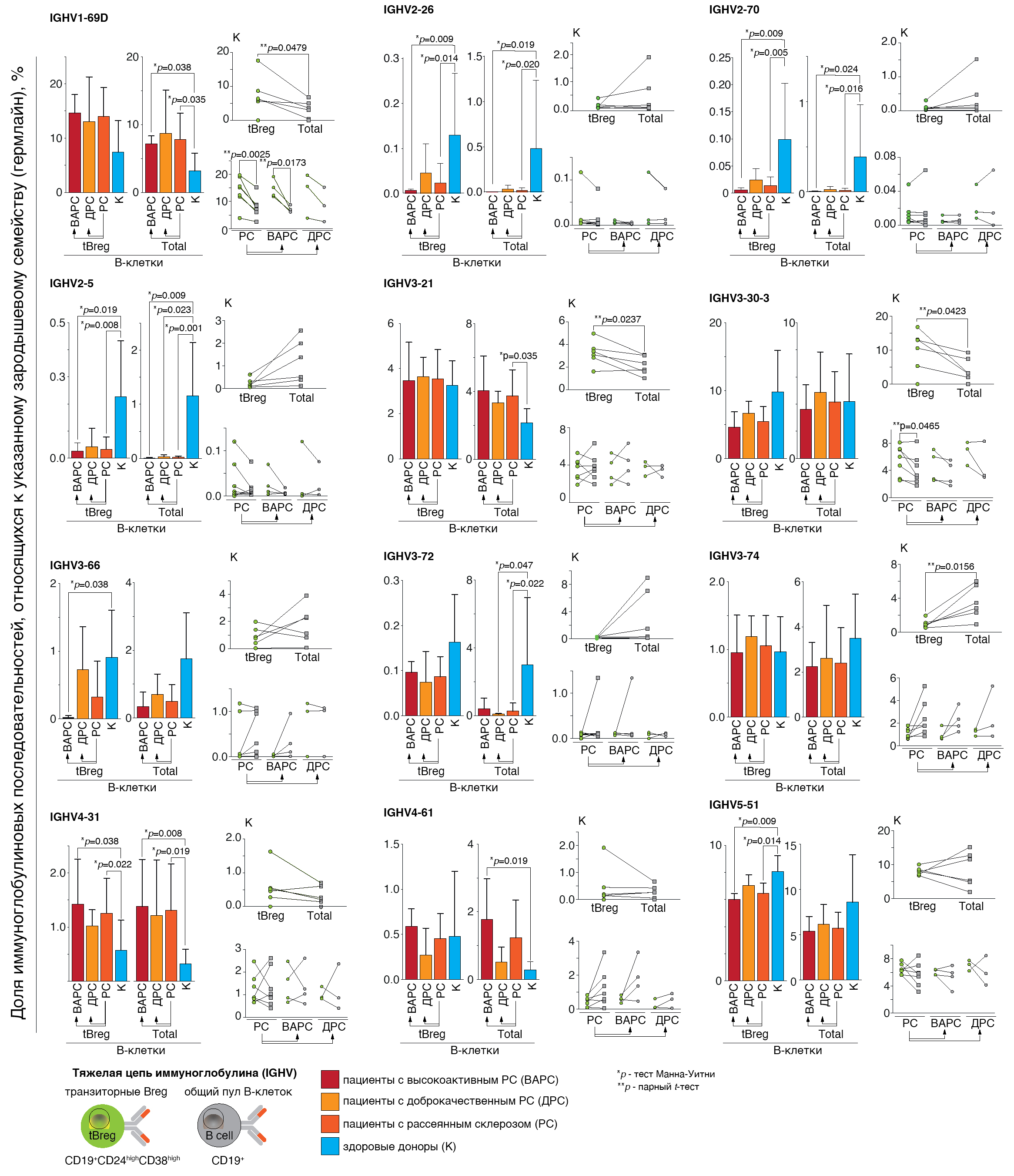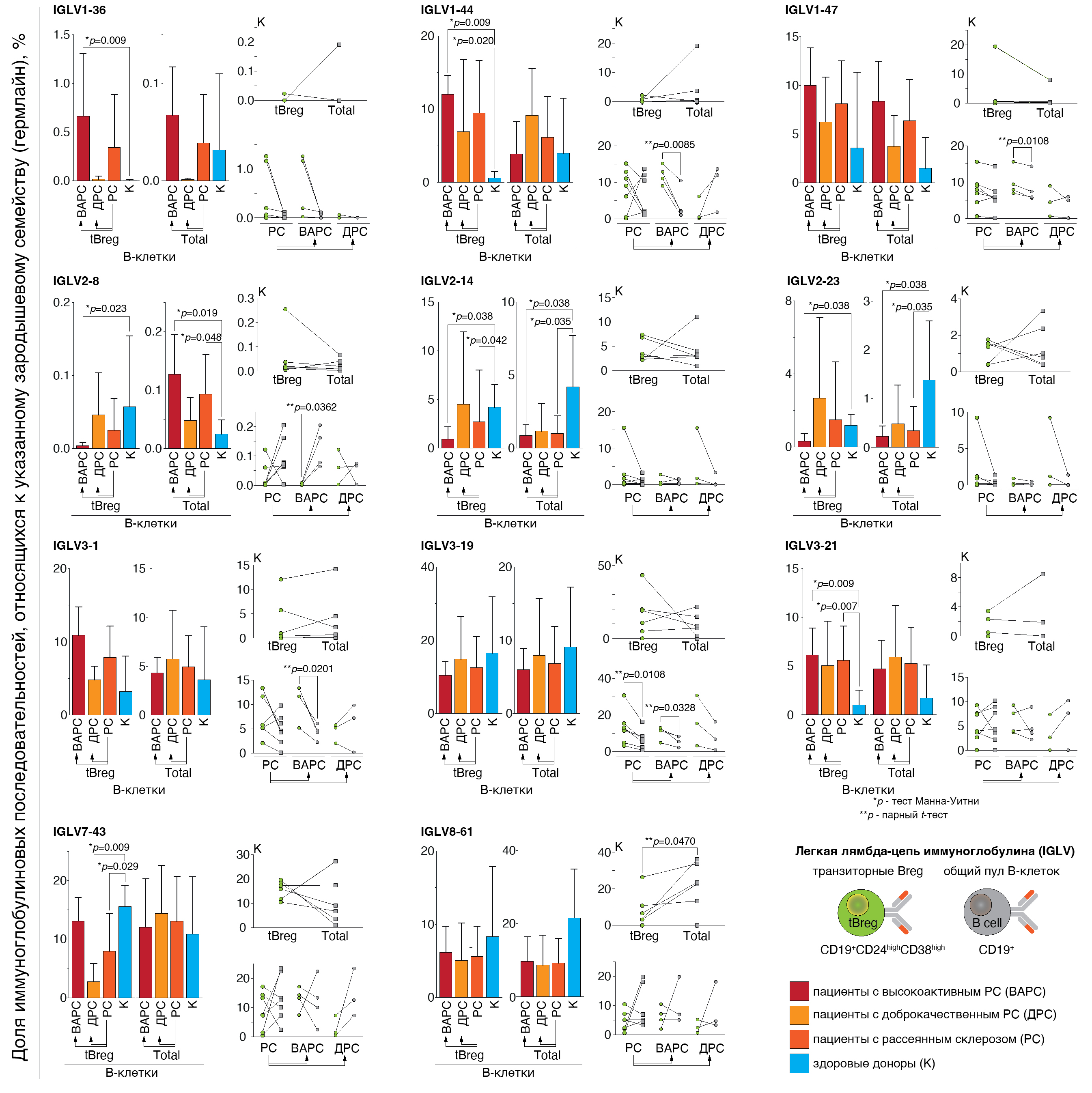 Immunological studies carried out in the 21st century have confirmed the crucial role of Bregs in maintaining immunotolerance, as well as controlling and reducing the inflammatory response. There are still many questions regarding the exact mechanism of its regulation, but it is obvious that a violation of the number and function of Breg cells leads to the development of various immunological pathologies, among which MS is particularly prominent. A detailed elucidation of inflammatory regulation by B cells will allow us not only to determine the etiology of autoimmune pathologies, but also may contribute to the development of Breg-based therapy in the near future. Immunoglobulins play an important role in the immune response by being exposed as antigen-specific receptors on the B-cell surface, as well as secreted antibodies. The recent progress achieved in the NGS analysis makes it possible to identify immunoglobulin repertoires with an unprecedented high level of detailing [32]. Therefore, it is extremely important to study the structure and functions of immunoglobulins, their specificity, and epigenetic status to understand the fundamental principles of MS onset and progression. Over the recent years, more and more patterns and stereotyped antibody responses have been discovered, when different individuals produce immunoglobulins recognizing certain antigenic epitopes using the same IgV genes [32–34]. In other words, certain immunoglobulin germlines exhibit tropism to certain antigens. Accordingly, variations in the usage of some immunoglobulin germline genes can be associated with a different antibody’s ability to generate an effective immune response, which may manifest itself as predisposition to various diseases, including autoimmune ones. It is likely that the differences in the germline gene frequency in each individual can be the result of an antiviral or autoimmune response. Before the onset of antigen-dependent B cell differentiation mediated by somatic hypermutation of immunoglobulin sequences, the diversity of immature B cells, including tBregs, is almost entirely determined by the configuration of the body’s germline genes (V(D)J recombination). Therefore, a detailed study of the immunoglobulin repertoire of immature B cells in patients with various autoimmune diseases, including MS, will help determine which rearrangements in the immunoglobulin germline genes can lead to functional disorders of the immune system.