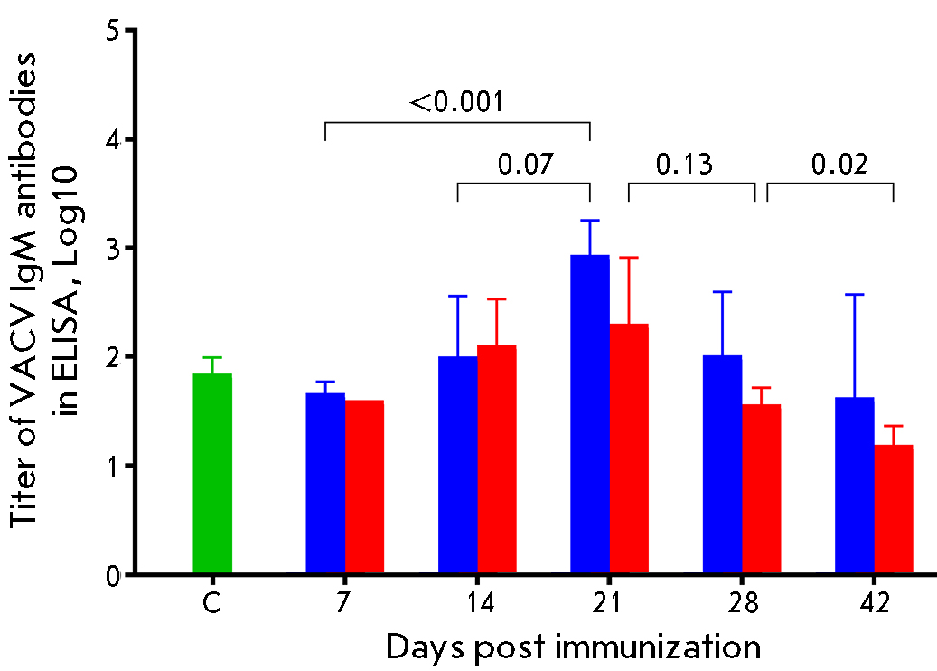Fig. 2. Concentration of VACV-specific IgM in the serum samples of mice immunized with VACV LIVP at a dose of 105 pfu determined by ELISA. Blue bars – i.d. injection of the VACV LIVP; red bars – s.s. inoculation of the VACV LIVP. C (control) – serum samples from mice that received saline. The diagrams show the geometric mean with GSD. The statistical analysis was performed using the GraphPad Prism 9.0 software. P values are above horizontal brackets