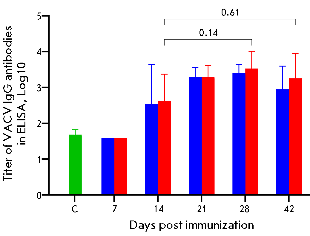 Fig. 3. Concentration of VACV-specific IgG in the serum samples of mice immunized with the VACV LIVP at a dose of 105 pfu determined by ELISA. Blue bars – i.d. injection of the VACV LIVP; red bars – s.s. inoculation of the VACV LIVP. C (control) – serum samples from mice that received saline. The diagrams show the geometric mean with GSD. The statistical analysis was performed using the GraphPad Prism 9.0 software. P values are above horizontal brackets