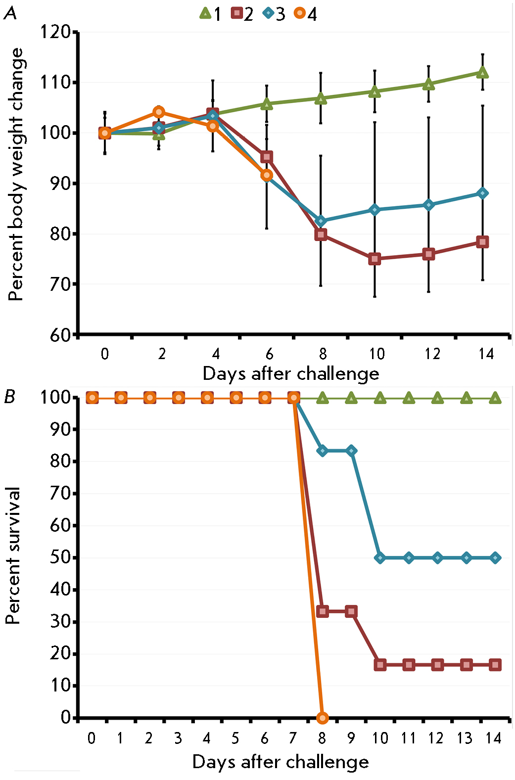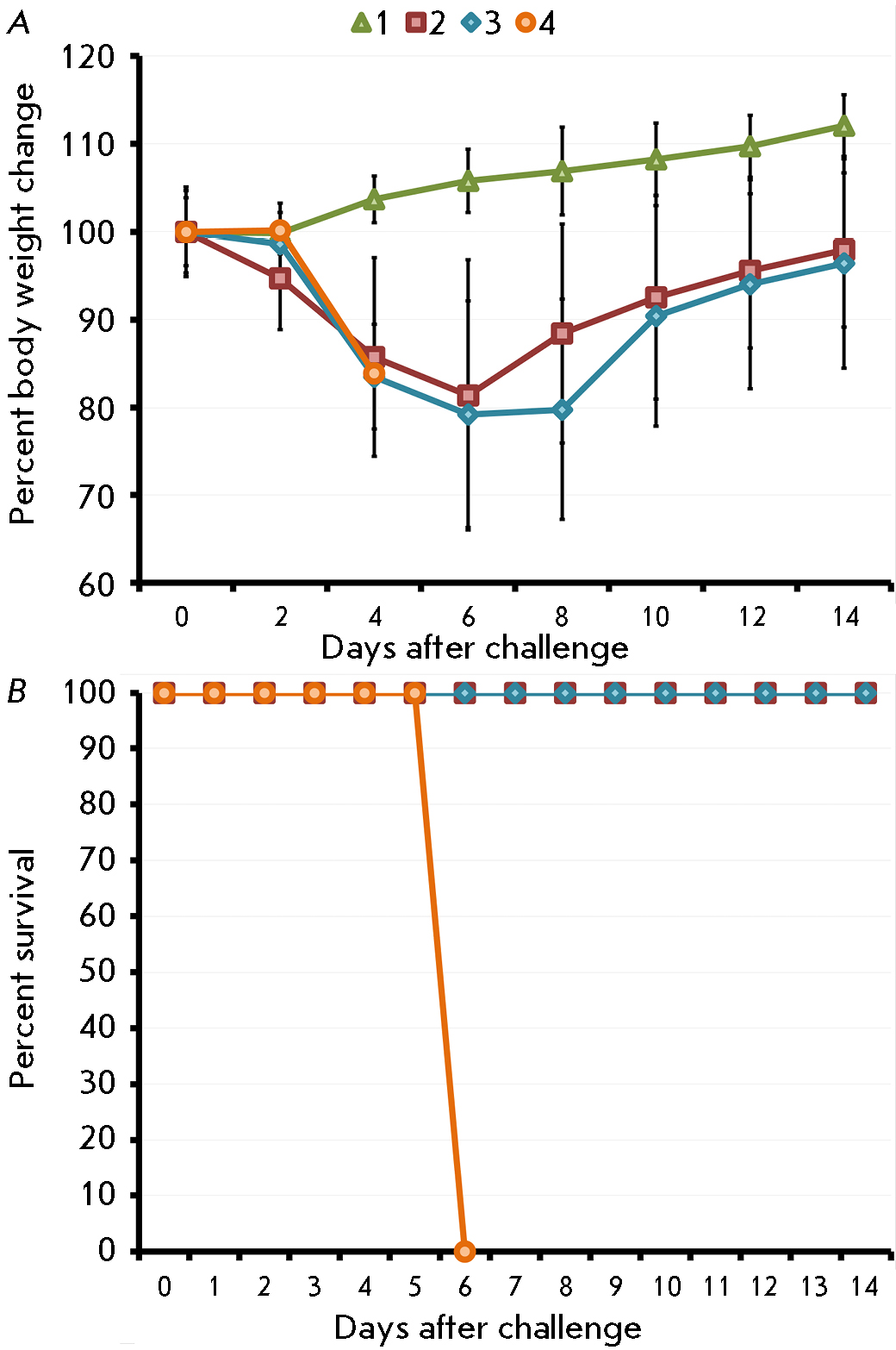 Fig. 5. The dynamics of body weight change (A) and death of mice (B) immunized with VACV LIVP at a dose of 105 pfu after i.n. infection with ECTV K-1 at a dose of 300 LD50. Data for groups consisting of six animals immunized using the s.s. (2) or i.d. (3) technique, as well as the groups consisting of non-immunized animals either non-infected (1) or infected with ECTV K-1 (4), are shown