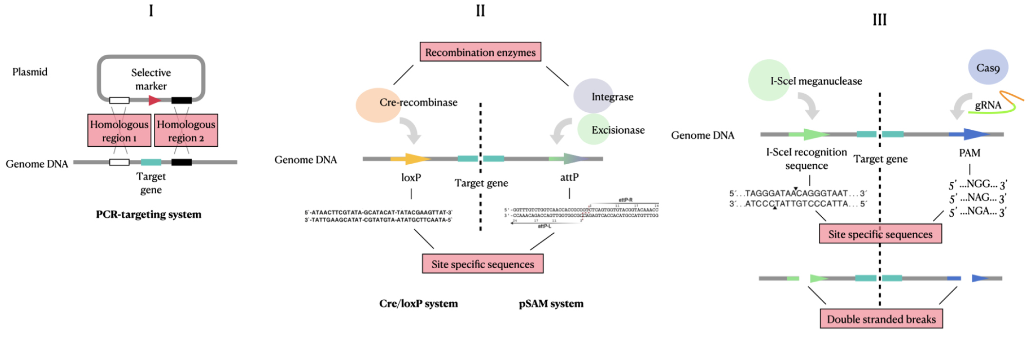 В качестве инструментов для введения мутаций используются три фундаментальных процесса: гомологичная рекомбинация, лежащая в основе PCR-Targeting System, где используются гомологичные последовательности, необходимые для рекомбинации, и в результате получают делеции. Второй молекулярный механизм – сайт-специфическая рекомбинация, применяемая в Cre-loxP Recombination System и pSAM2 Site-Specific Recombination System. Ключевой особенностью является наличие специальных сайтов: loxP-последовательности для Сre-рекомбиназы и attP-последовательности для системы pSAM2. В данном процессе участвуют не только специфические последовательности, но и ферменты, осуществляющие рекомбинацию в строго определенных участках генома, что повышает точность происходящего процесса. Третий процесс, лежащий в основе сайт-направленного мутагенеза – введение двухцепочечных разрывов такими нуклеазами, как I-SceI-мегануклеаза (I-SceI Meganuclease-Promoted Recombination System) и Cas-никаза (CRISPR/Cas-Based Genome Editing). Введенные в ДНК двухцепочечные разрывы в дальнейшем восстанавливаются системами репарации клетки (рис. 3).