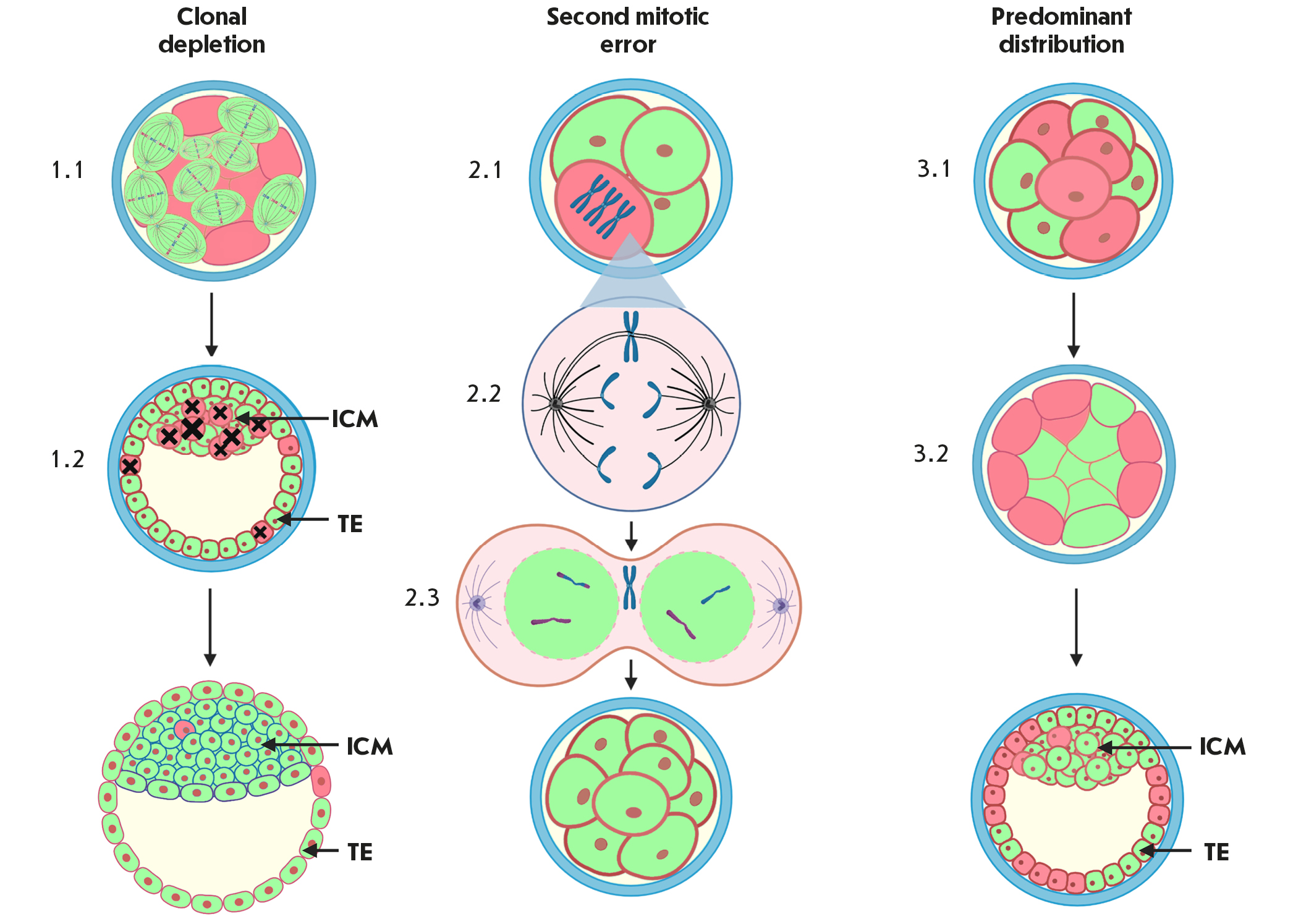 Mitotic errors associated with mosaicism in an originally euploid embryo include anaphase lag, mitotic nondisjunction, endoreplication, formation of tripolar spindles, premature division of cells before DNA replication, and chromosome breakage [39, 49].