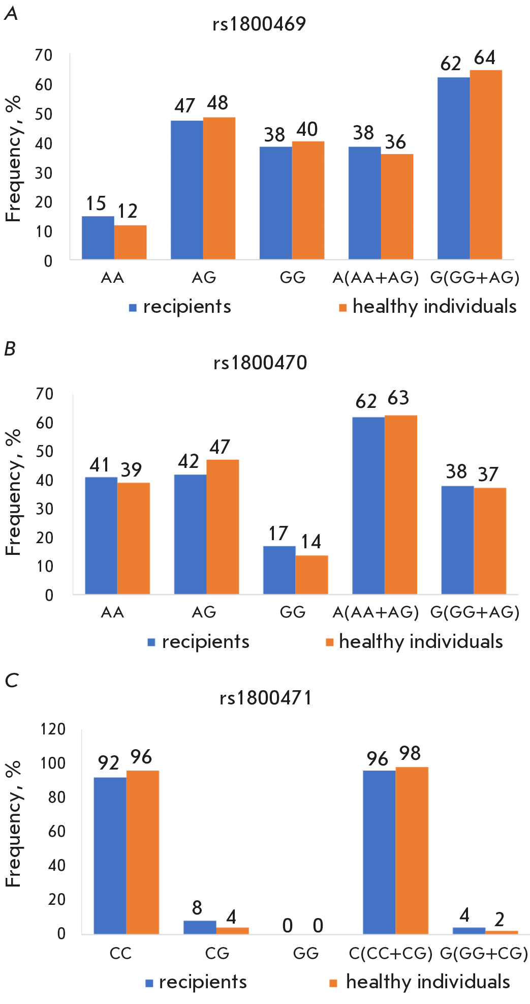 Fig. 1. Frequency distributions of Tgfb1 SNPs rs1800469 (A), rs1800470 (B), and rs1800471 (C) in children with liver diseases and healthy individuals