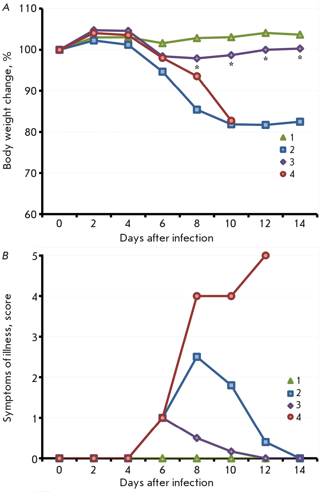 Рис. 9. Динамика изменения массы тела (А) и клинических проявлений инфекции (Б) после и/н заражения ECTV-K1 мышей, вакцинированных LIVP (2) или LIVP∆ati (3), на 60-й день после иммунизации. Приведены данные для групп из 6 животных. В качестве контрольных использованы группы невакцинированных мышей, не инфицированных ECTV-K1 (1) и зараженных этим вирусом (4). Звездочкой обозначены временные точки, в которых среднее значение массы тела в процентах от первоначального веса в группе иммунизированных LIVP∆ati мышей достоверно отличается от значения в группе мышей, иммунизированных LIVP. Сравнение проводили с помощью t-критерия Стьюдента для независимых выборок