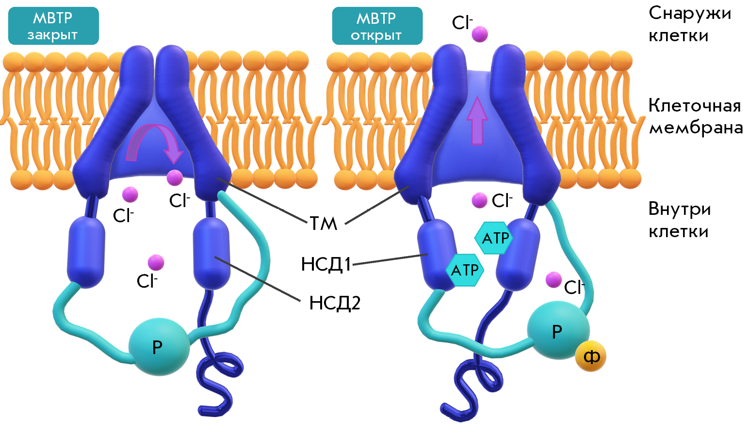 Fig. 1. Schematic representation of a CFTR protein in the closed (left) and open (right) positions. TM – the transmem- brane domains that form a channel for chloride ions transport. NSD1 and NSD2 – intracellular nucleotide-binding domains 1 and 2. R – the regulatory domain that contains phosphorylation sites (P). Channel activation requires the presence of a phosphoric acid residue on the regulatory domain. NSD1 and NSD2 bind and hydrolyze ATP, resulting in the opening of the channel through interaction with transmembrane domains [7]