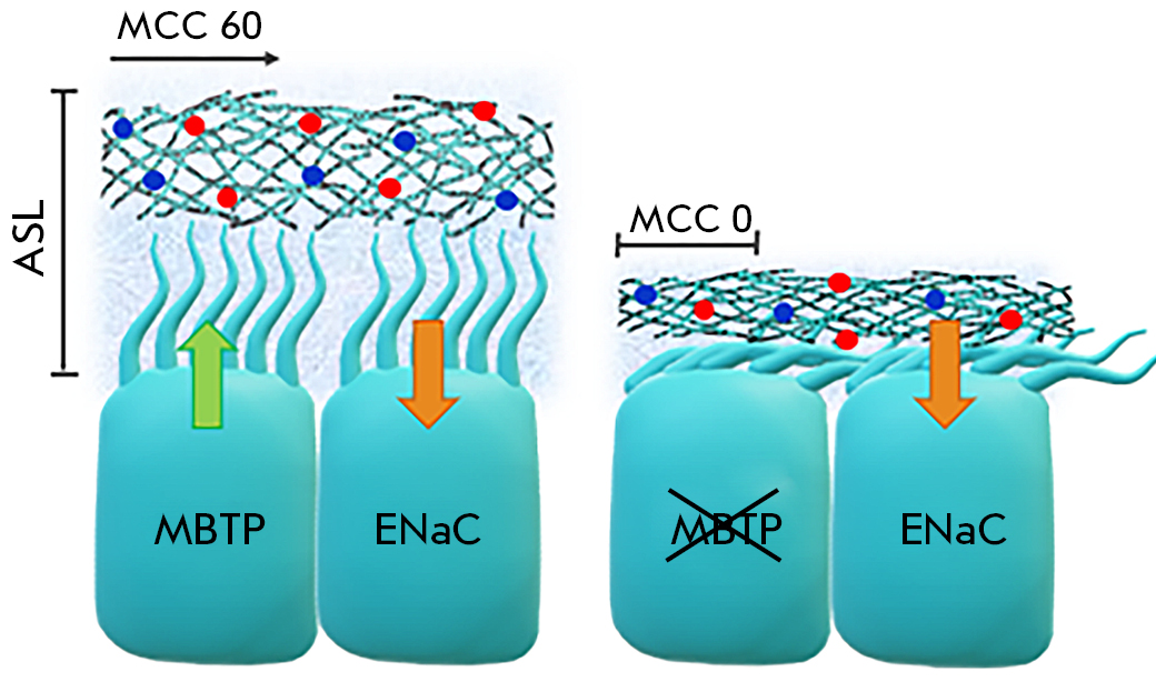 Secretion and absorption are two opposite processes associated with the transport of the electrolytes regulating the viscoelastic properties of the liquid component of exocrine secretions. According to available data, electrolyte transport dysfunctions in CF occur both at the level of salt absorption and at the level of fluid absorption and secretion, which are mediated by anions [8]. A decrease in chlorine ion content in the intercellular space activates the epithelial sodium channel (ENaC), which increases the Na content in the cell (Fig. 2). It, in turn, boosts the absorption of Cl– ions and water and causes abnormalities in transepithelial electrical potential difference. As a result, the volume of fluid on the airway surface decreases, its viscosity increases significantly, and the clearance rate on the ciliated epithelial surface is sharply reduced (Fig. 2). Such processes in the lungs lead to dehydration of the airways and, subsequently, a reduction in the cleansing effect of epithelial cilia and mucosa in general. What is more, mucus congestion also favors the rapid development of infections [9].