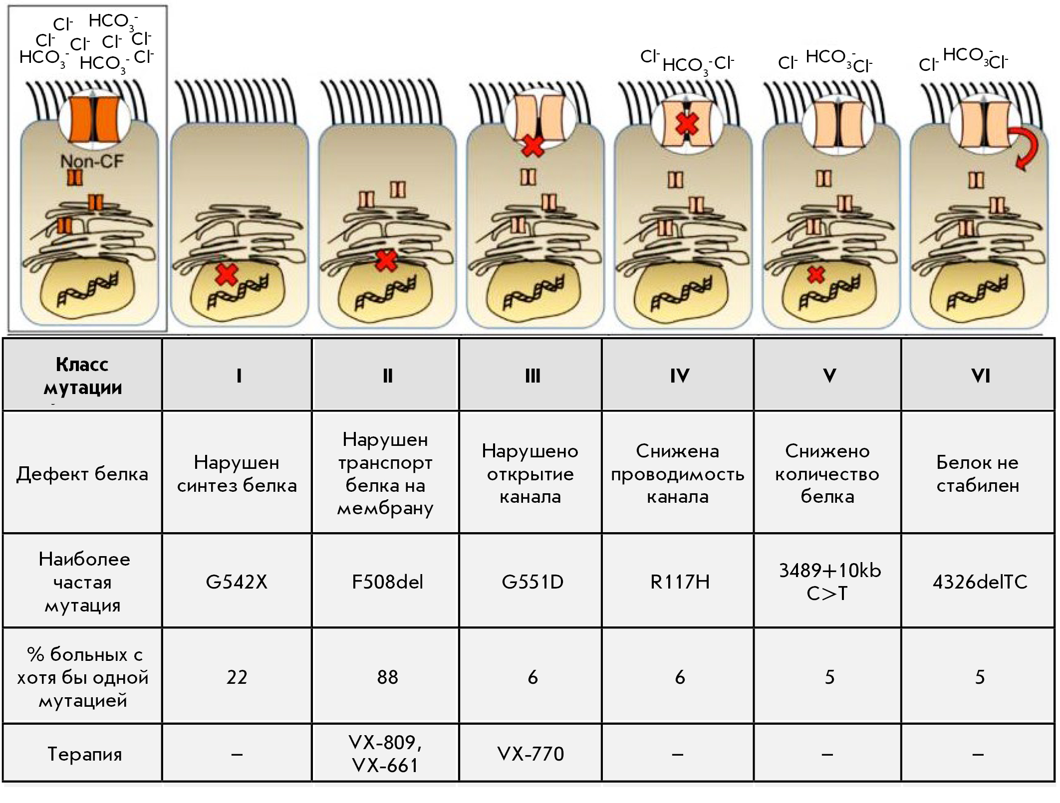 CF is an autosomal recessive disease caused by mutations in the СFTR gene identified in 1989 by a research team headed by Lap-Chee Tsui [15, 16]. The CFTR gene is localized on chromosome 7 and consists of 27 exons and codes for a protein composed of 1,480 amino acid residues. Over 2,000 mutations in the CFTR gene have currently been described, and the list is updated on a regular basis, but only 250–300 of these mutations have pathological consequences, and among those only 20 are relatively common (over 0.1% of patients) [17]. Five classes of mutations (seven, according to some authors) are identified based on the associated defects (Fig. 3). Class I–III (severe) mutations are associated with a fundamental CFTR dysfunction; and class IV–V (mild) mutations, with the residual function of the CFTR protein [18]. Various mutations in the CFTR gene may impair the synthesis, processing, stability, and functioning of the CFTR protein, as well as its intracellular transport from the endoplasmic reticulum to the Golgi complex and degradation, which leads to a variety of phenotypic manifestations [19].
