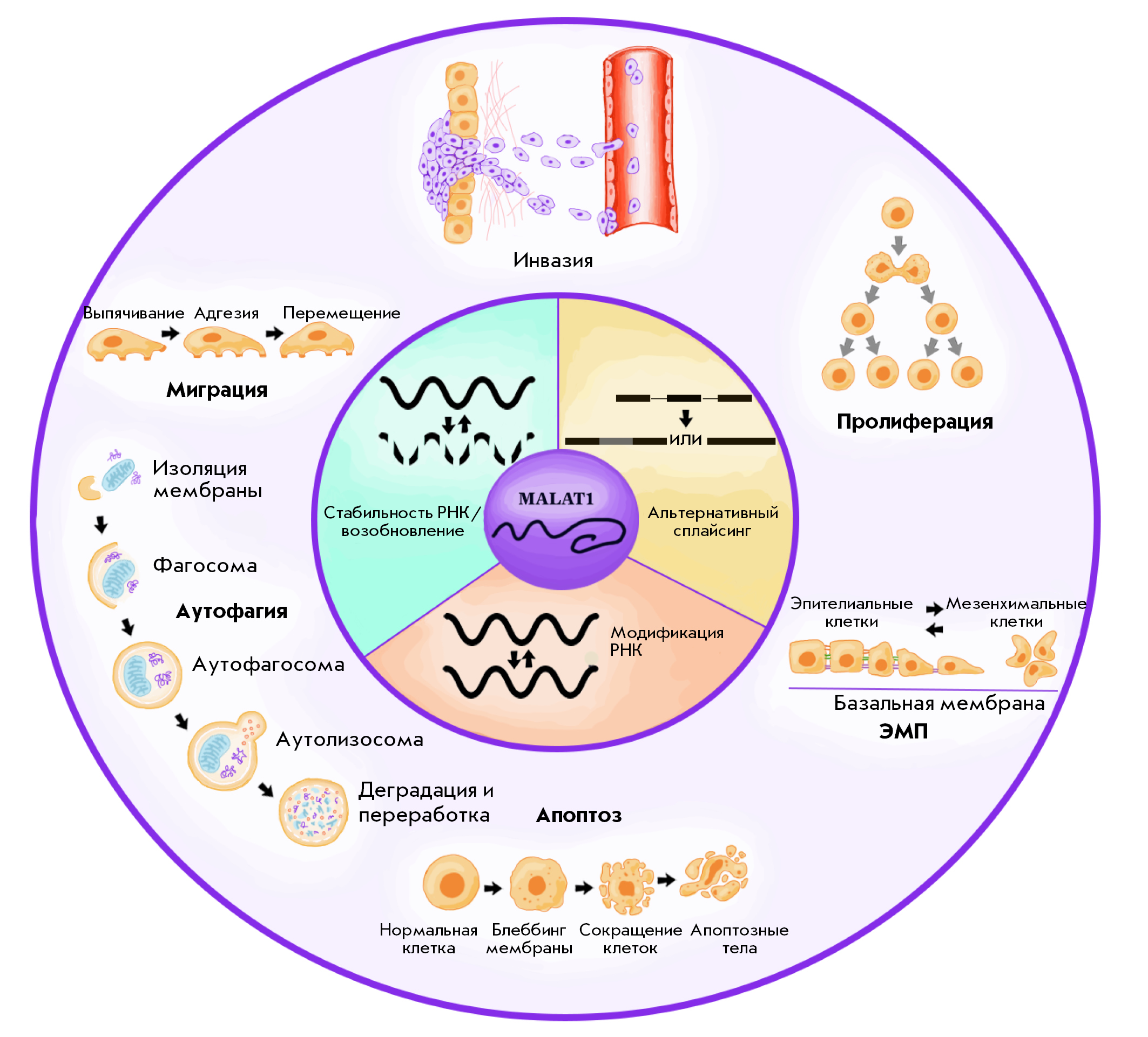 Рис. 2. Основные функции длинной некодирующей РНК MALAT1 в клетке