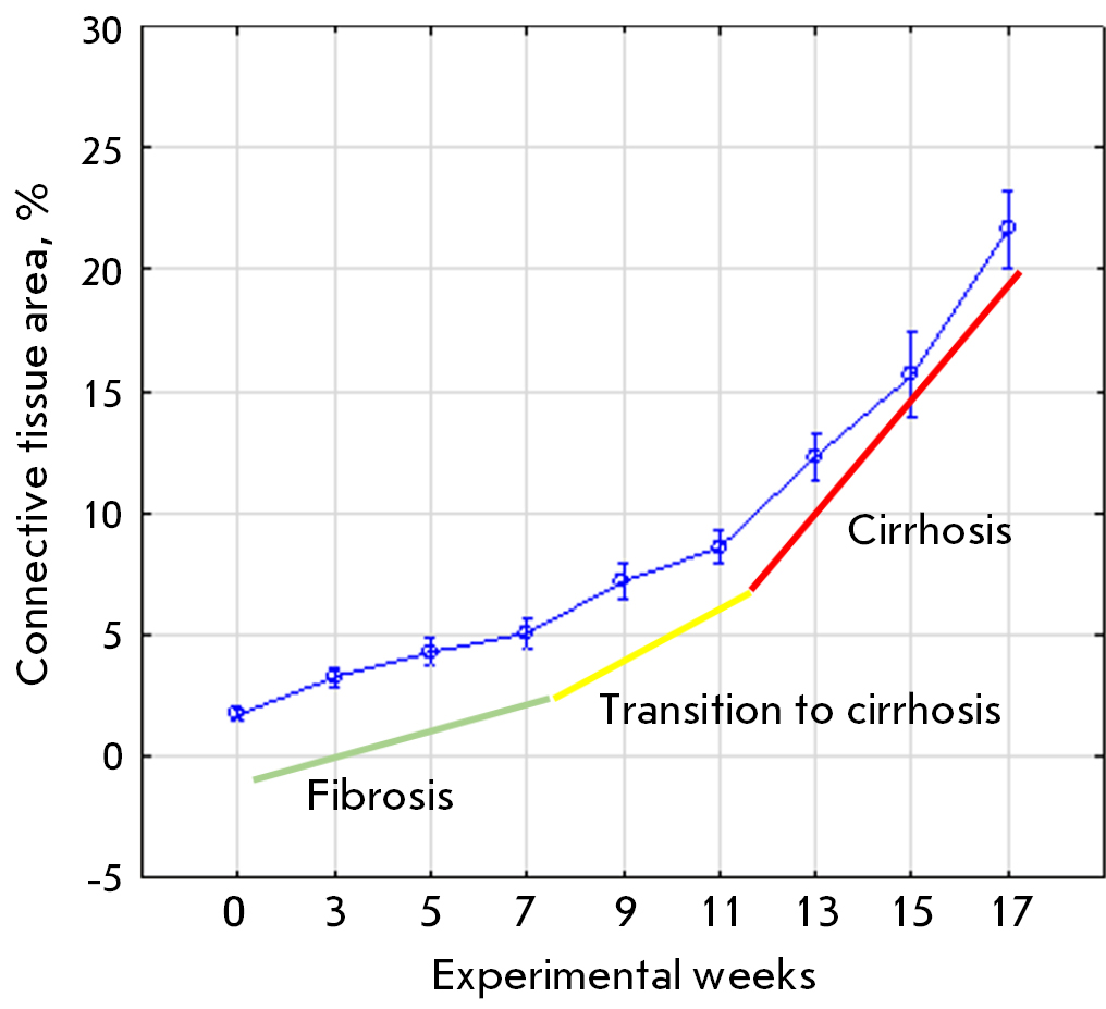 By the 3rd week into the experiment, a moderate formation of fibrous connective tissue was observed in the portal zones (F1, Fig. 1B). In the 5th week, the formation of fibrous tissue slowed down, but at the same time it was simultaneously detected both in the portal zones and in the parenchyma (bridging fibrosis, F2/F3). By the 7th week, the intensity of connective tissue synthesis remained almost at the same level as in the 5th one (F3/F4, Fig. 1C). At the stage of transition from fibrosis to cirrhosis, an increased formation of connective tissue similar to that in the 3rd week of the experiment was observed, again. In nine weeks, in the portal zones, the formation of false hepatic lobules occurred, a morphological criterion for initial fibrosis to cirrhosis transition (F4/F5, Fig. 1D). In the period from the 11th to 17th week, connective-tissue proliferation reached its maximum value (F6, Fig. 1E,F).