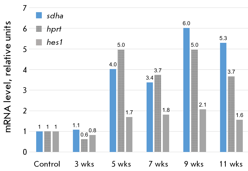 To normalize the RT-PCR data, the hes1 gene was chosen as a reference one, since its expression level proved the most stable throughout the experiment. The use of hprt1 and sdha as reference genes was considered inappropriate due to the high variability of their mRNA levels. RT-PCR efficiency for the target (mmp-9) and the reference gene differed by less than 1% [25]; so, the relative mRNA level was assessed using the standard Livak and Schmittgen’s method [26]. The data on a normalized level of mmp-9 mRNA expression are shown in Fig. 5.