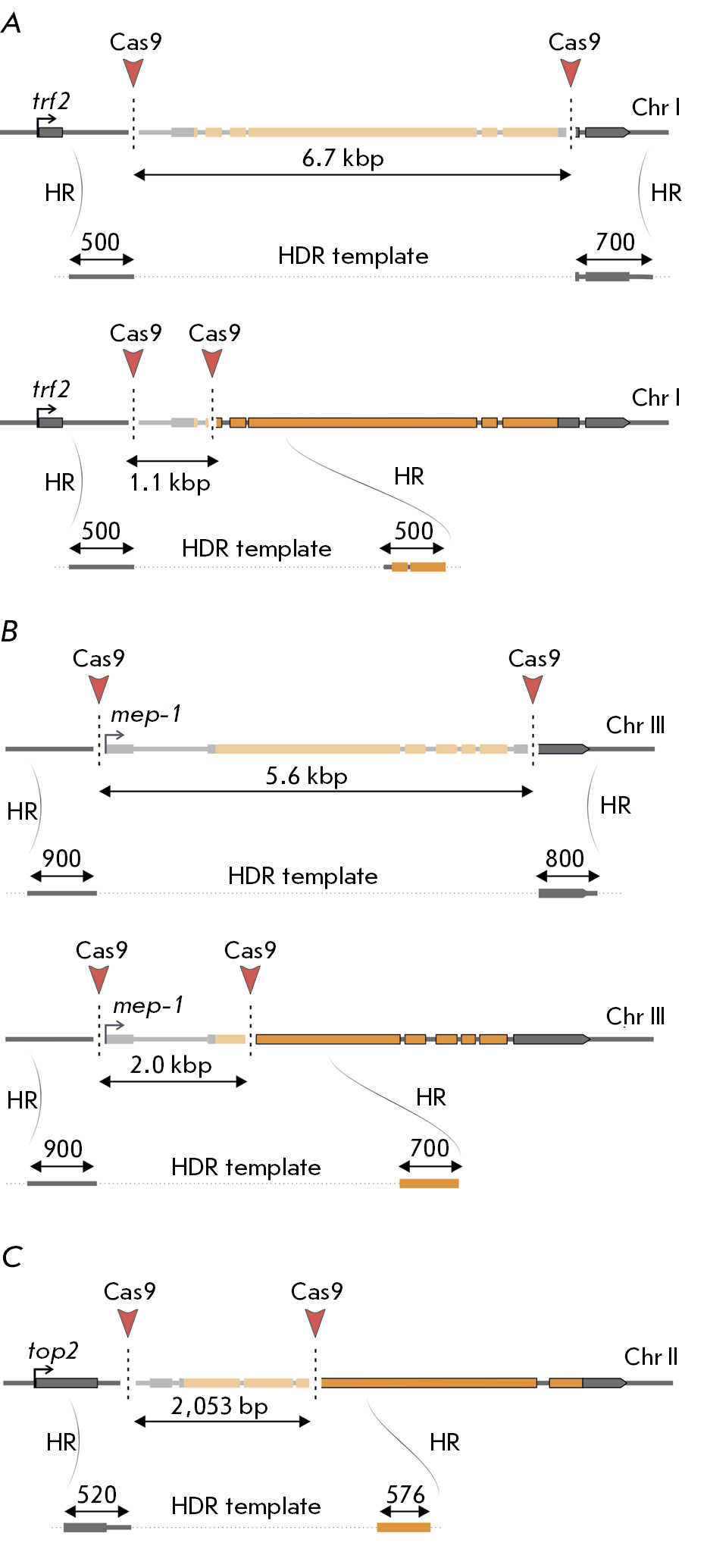 Fig. 2. CRISPR/Cas9- and HDR-mediated gene replace- ment with the attP site and reporter gene mCherry. The genes trf2 (A), mep-1 (B), and top2 (C) and homologous recombination templates for either full-length or partial deletions are presented
