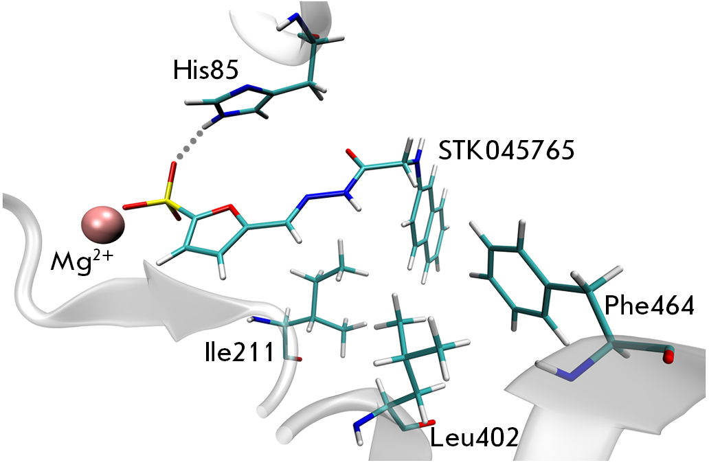 Fig. 2. Model of the enzyme-inhibitor complex of mbTK and STK045765. The sulfo group is able to interact with the Mg2+ ion and form a hydrogen bond with the His85 residue; the hydrophobic bicyclic structural fragment is complementary to the site formed by the Ile211, Leu402, and Phe464 residues. The figure was prepared using VMD 1.9.2 [11]