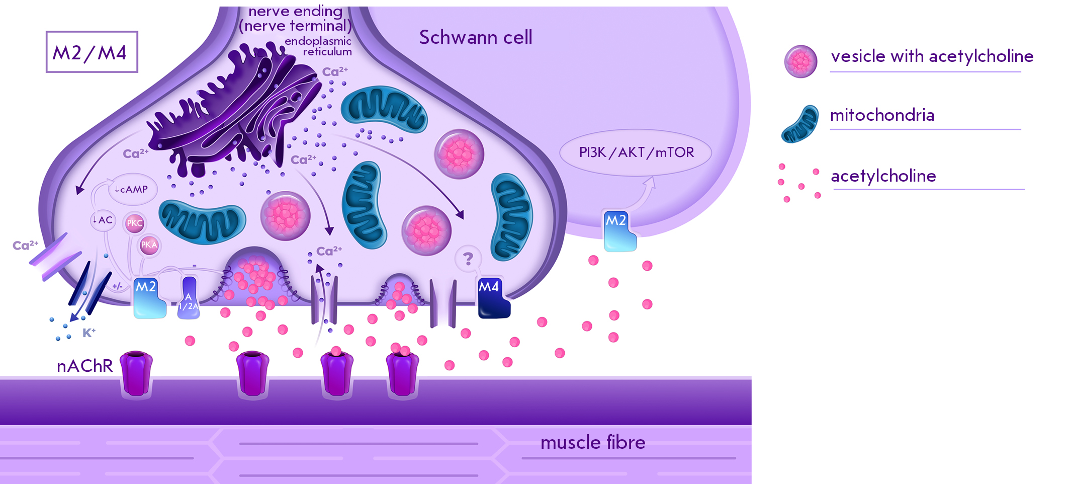 Thus, different mAChR subtypes ensure the functionality of the tripartite synapse (nerve ending – muscle fiber – Schwann cell) and coordinate the development and morphological properties of the synapse with its activity.