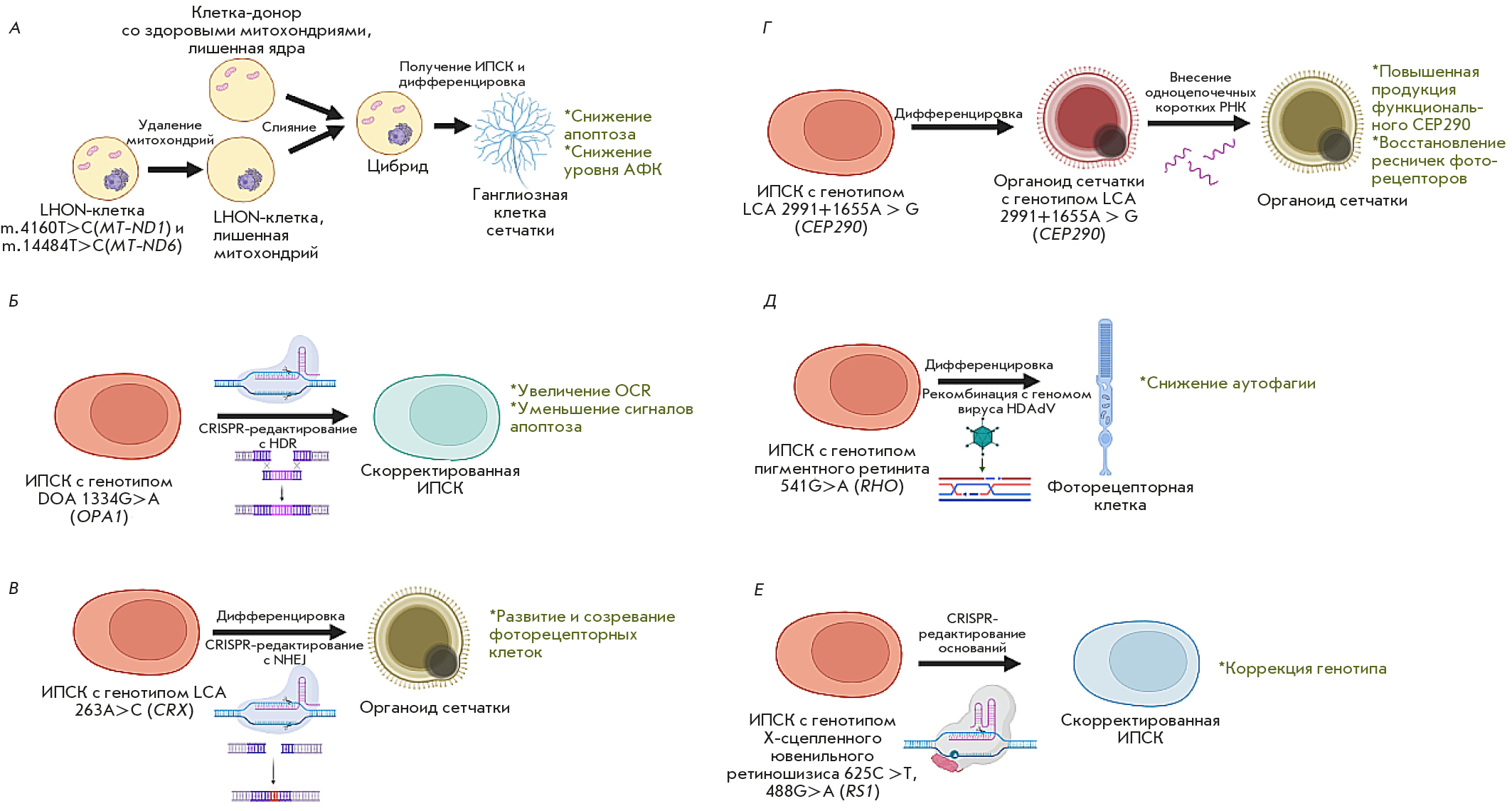 Рис. 1. Подходы к генной терапии наследственных ретинопатий/нейропатий на моделях ИПСК. А – замена митохондрий, создание цибридов на модели LHON. Б – CRISPR-редактирование с HDR на модели DOA. В – CRISPR-редактирование NHEJ на модели LCA. Г – РНК-интерференция на модели LCA. Д – рекомбинация с геномом вируса HDAdV на модели пигментного ретинита. Е – CRISPR-редактирование оснований при помощи ABE7.10 на модели Х-сцепленного ювенильного ретиношизиса