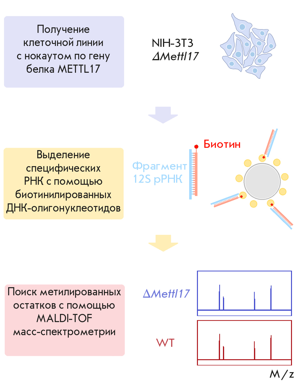 В настоящей работе нами была проверена гипотеза о том, что фактор METTL17 метилирует участок 12S рРНК, с которым он взаимодействует во время сборки митохондриальной рибосомы. В первую очередь получили клеточную линию с нокаутом по гену белка METTL17, позволяющую сравнить метилирование участка 12S рРНК в норме и в отсутствие фактора METTL17. Для проверки метилирования 12S рРНК использовали метод выделения специфических РНК с помощью биотинилированных ДНК-олигонуклеотидов. Фрагменты РНК выделяли из клеток дикого типа и клеток с нокаутом по гену белка METTL17. Выделенные и очищенные образцы РНК анализировали с помощью MALDI-TOF масс-спектрометрии. Сравнение масс РНК из клеток дикого типа и из линии с нокаутом и с предварительно рассчитанными теоретическими массами позволило нам проверить гипотезу о метилировании рРНК фактором METTL17.