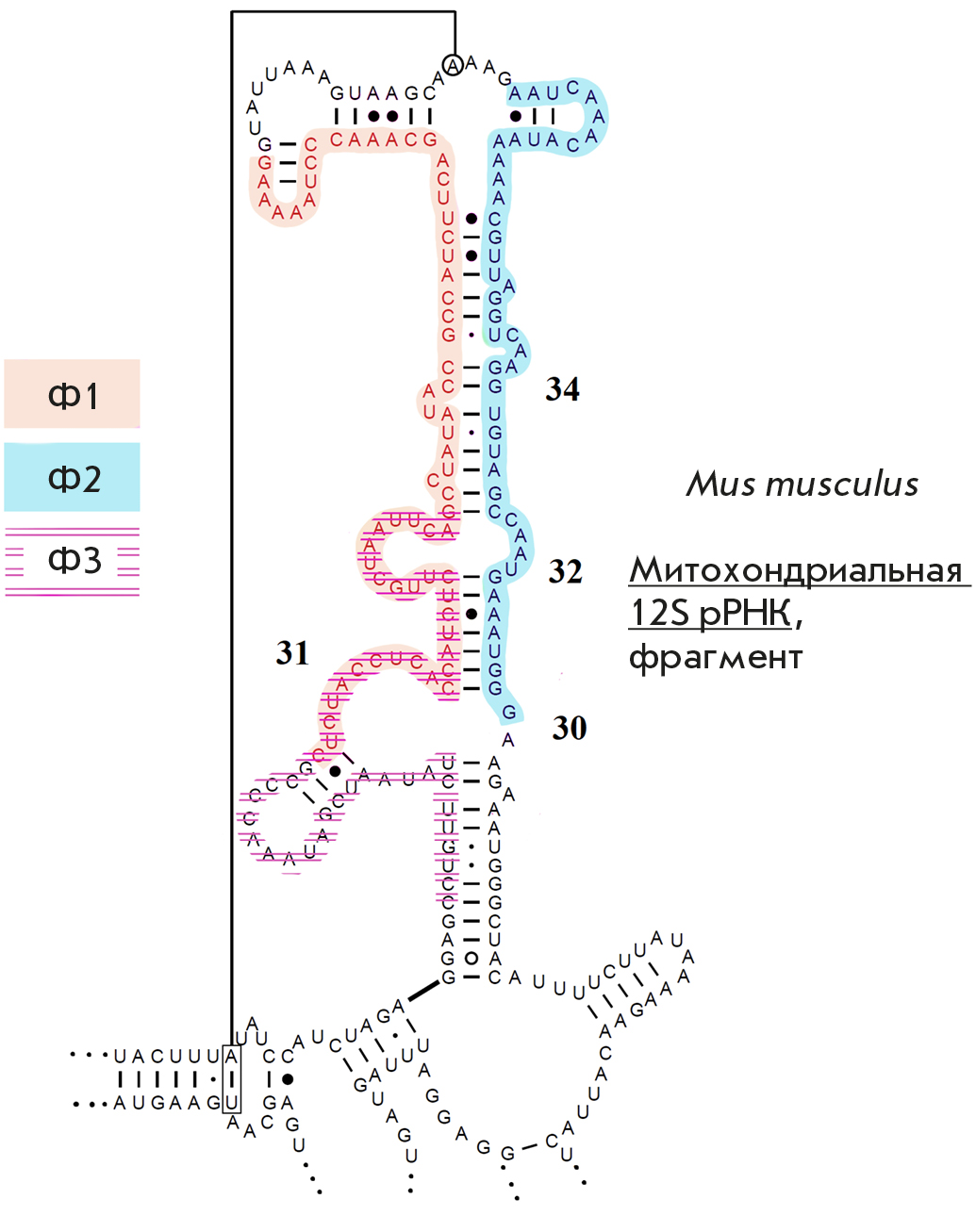 Рис. 3. Фрагменты 12S рРНК мыши, проанализированные с помощью масс-спектрометрии (Ф1, Ф2, Ф3). Два фрагмента (Ф1, Ф3) частично перекрываются. Изображение адаптировано из ресурса [15]