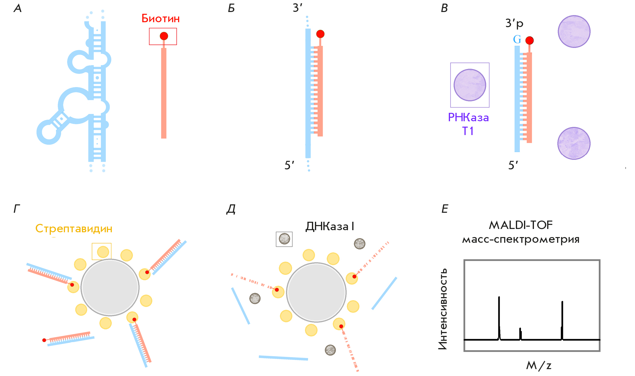 Рис. 4. Схема выделения фрагментов РНК с помощью биотинилированных олигонуклеотидов. А – участок 12S рРНК (показан голубым) и биотинилированный олигонуклеотид (коралловый, биотин – красный). Б – после отжига вторичные структуры рРНК расплавляются, происходит гибридизация участка рРНК и олигонуклеотида. В – после обработки РНКазой Т1 остается ДНК-РНК-дуплекс, РНКаза Т1 разрезает оцРНК после остатков гуаниловой кислоты, оставляя 3’-фосфат. Г – дуплексы ДНК-РНК связываются с магнитными шариками за счет биотин-стрептавидинового взаимодействия. Д – после обработки ДНКазой I ДНК разрушается, РНК переходит в раствор. Е – анализ выделенных фрагментов РНК с помощью MALDI-TOF масс-спектрометрии