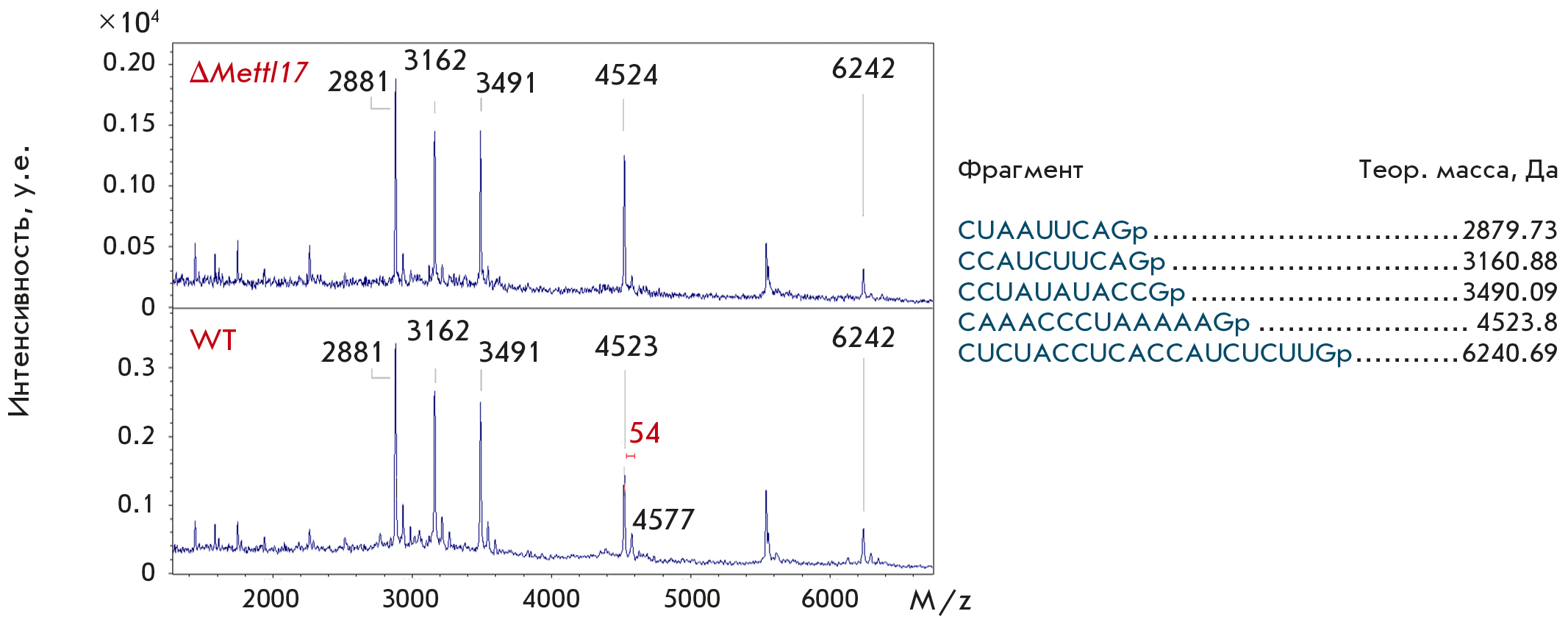 Рис. 6. Масс-спектры Фрагмента 1 (пики на РНК из линии с нокаутом гена белка METTL17 показаны сверху, линии дикого типа – снизу). Масс-спектр получен в линейном режиме. Теоретически рассчитанные пики для Фрагмента 1 подписаны