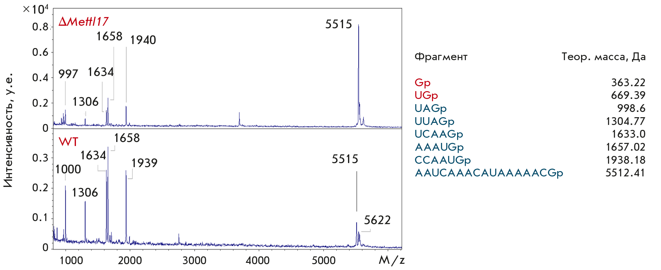 На полученных масс-спектрах присутствуют все фрагменты с предсказанной массой, за исключением двух коротких фрагментов (1–2 нуклеотидных остатка) на хроматограмме Фрагмента 2 (рис. 7) и фрагмента длиной 4 нуклеотидных остатка на хроматограмме Фрагмента 3 (рис. 8). В первом случае масса фрагмента была очень мала, из-за этого ее не удалось зафиксировать. Во втором случае мы предполагаем, что фрагмент CCUGp не попал в раствор из-за того, что был отщеплен РНКазой Т1. Этот участок расположен на конце анализируемого фрагмента, поэтому возможно отщепление РНКазой из-за короткой длины двухцепочечного участка. Несмотря на это, в процессе эксперимента была проверена вся область 12S рРНК, близко контактирующая с METTL17. Это позволяет заключить, что METTL17 не метилирует фрагмент 12S рРНК в области спиралей 31–34, приводя к изменению пространственной конформации этого участка рРНК.