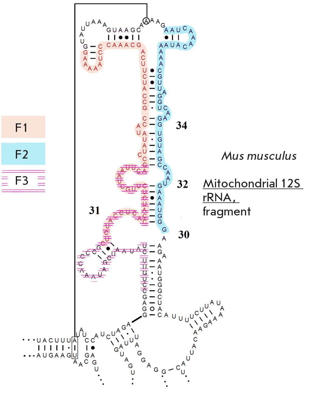 Fig. 3. Mouse 12S rRNA fragments analyzed using mass spectrometry (F1, F2, F3). Two fragments (F1, F3) partially overlap. Image adapted from [15]