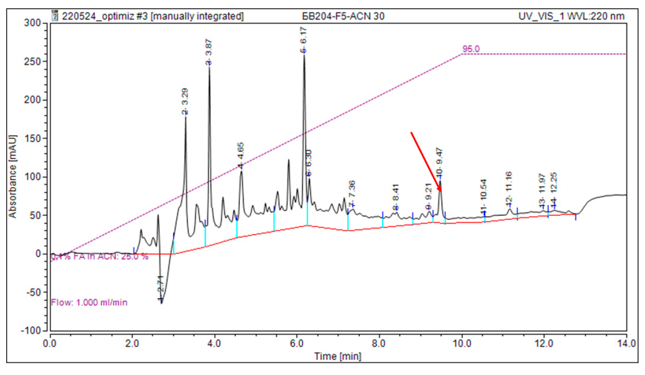 HPLC analysis and fractionation were performed in a Vanquish Flex system with a diode array detector (Thermo Fisher Scientific, USA) equipped with a 5 μm C18(2) 100 Å, 250 × 4.6 mm Luna column (Phenomenex), flow rate 1 mL/min, injection volume 20 μL. A 0.1% aqueous THF solution was used as eluent A and acetonitrile with 0.1% THF as eluent B. Elution was performed by increasing the eluent B concentration from 25 to 95% for 10 min and then maintaining it at 95% for 2 min. Fractions of 1 mL were collected to analyze their antibacterial activity (Fig. S8).