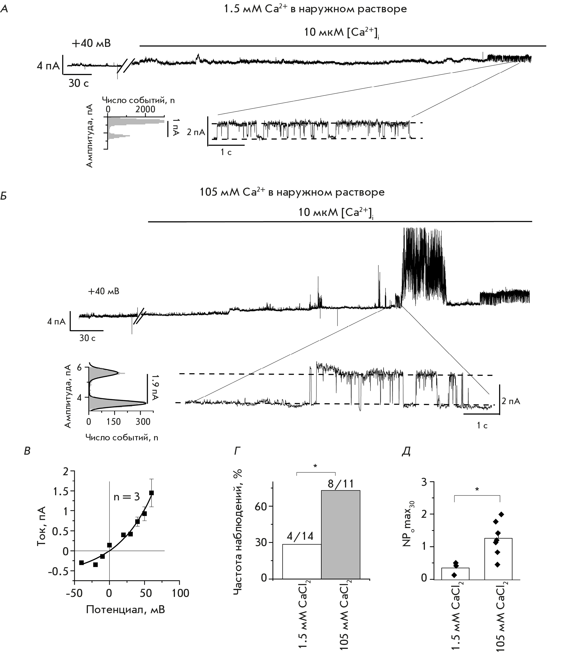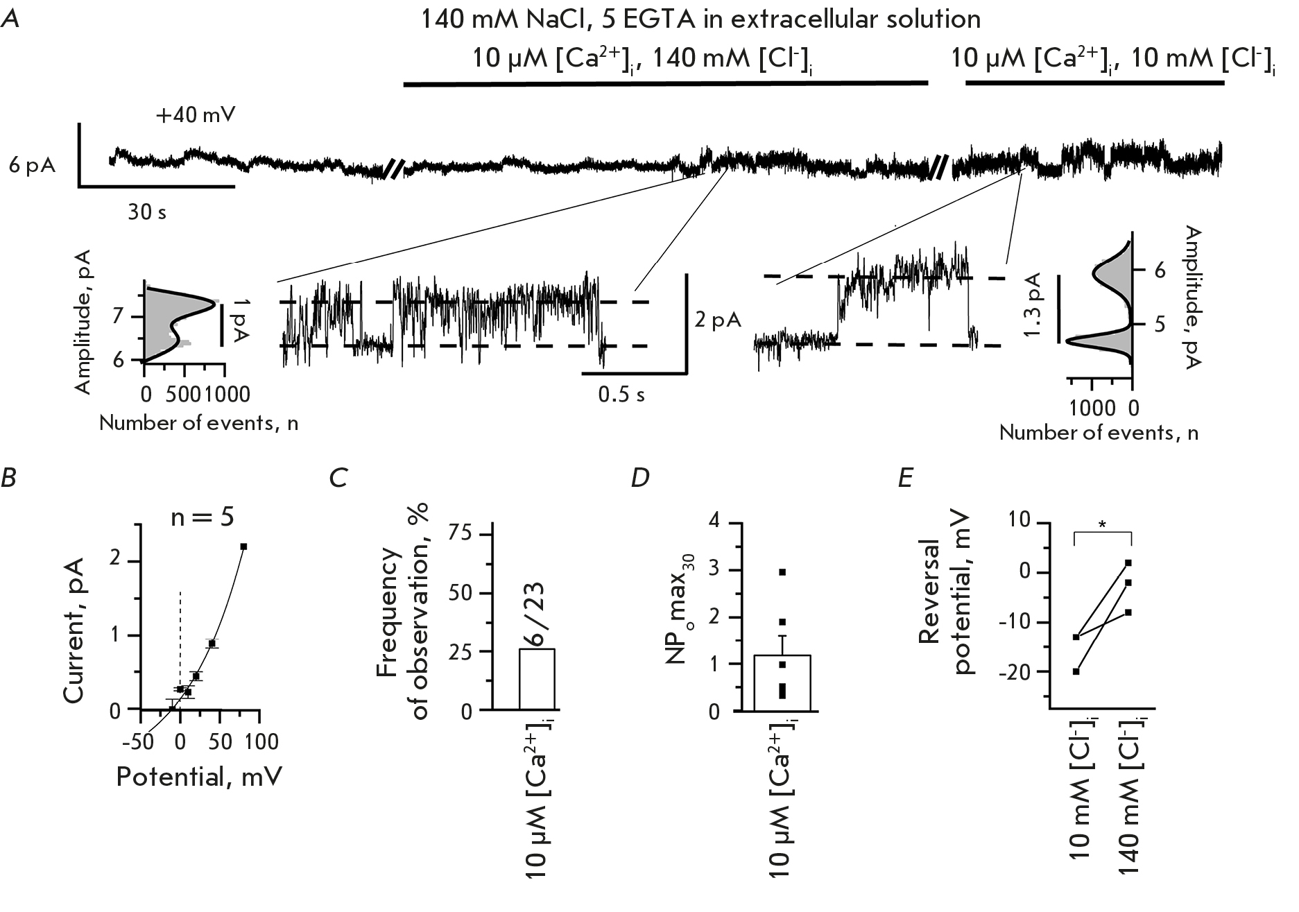 Being calcium-activated (EC50 = 10 µM at +40 mV), the ANO6 channel is not only regulated by intracellular calcium ions but can also conduct Ca2+ ions [4]. Thus, anionic conductance has been detected in some studies, while others have demonstrated that the channel has cationic conductance [4, 7]. Data on the effect of the extracellular calcium concentration on the electrophysiological properties of endogenous ANO6 channels is quite scarce. Furthermore, it is unclear how changes in the intracellular concentration of free calcium ions ([Ca2+]i) or membrane potential affect the kinetics and substates of single endogenous ANO6 channels.