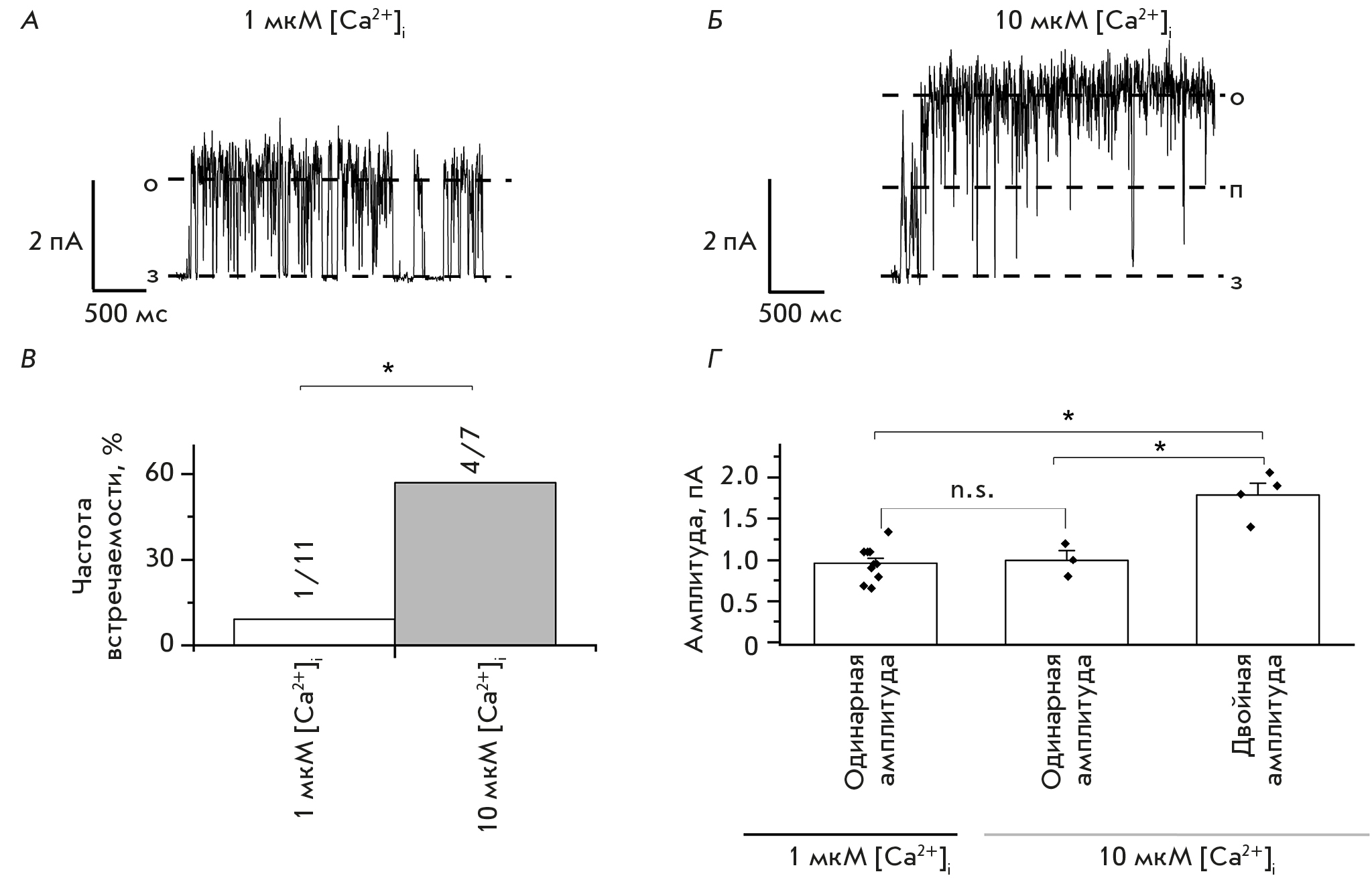 We discovered that channels with amplitude 0.95 ± 0.06 pA (n = 10/11) were typically activated in the presence of 1 µM [Ca2+]i (Fig. 3A). When using the solution containing 10 µM [Ca2+]i, we observed activation of channels with a similar amplitude (1 ± 0.12 pA (n = 3/7)), as well as channels with double amplitude (1.79 ± 0.14 pA (n = 4/7)) (Fig. 3B). In the solution containing 1 µM [Ca2+]i, activation of channels with double amplitude was observed only in 9% of the experiments (n = 1/11) (p < 0.05) (Fig. 3C,D).