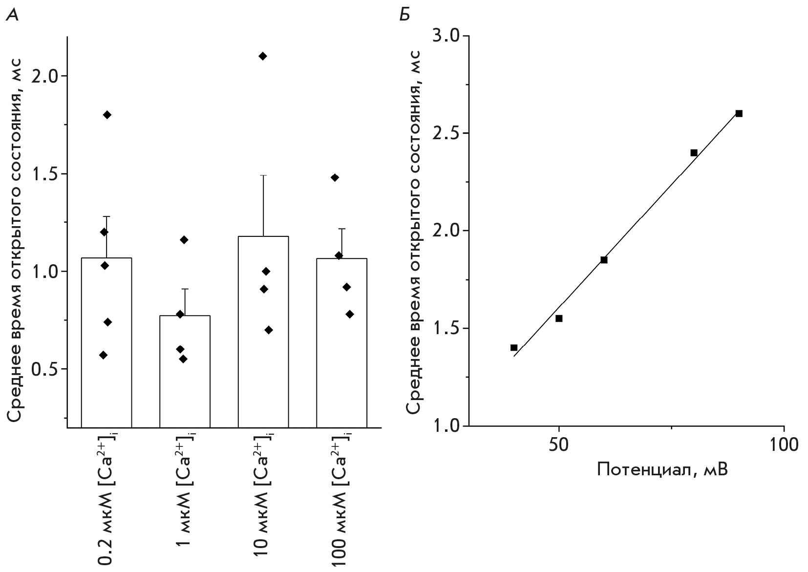 At 0.2 µM [Ca2+]i, the open state lifetime of channels was 1.07 ± 0.21 ms (n = 5); at 1 µM [Ca2+]i, – 0.77 ± 0.14 ms (n = 4); at 10 µM [Ca2+]i – 1.18 ± 0.31 ms (n = 4); and at 100 µM [Ca2+]i – 1.07 ± 0.15 ms (n = 4) (p > 0.05) (Fig. 4A). Therefore, the open state lifetime of channels was independent of variations in [Ca2+]i. An analysis of the dependence of the open state lifetime of endogenous ANO6 channels on the membrane potential at a fixed intracellular concentration of 100 µM [Ca2+]i demonstrated that the open state lifetime of CaCC increases linearly with increasing potential upon membrane depolarization (Fig. 4B).