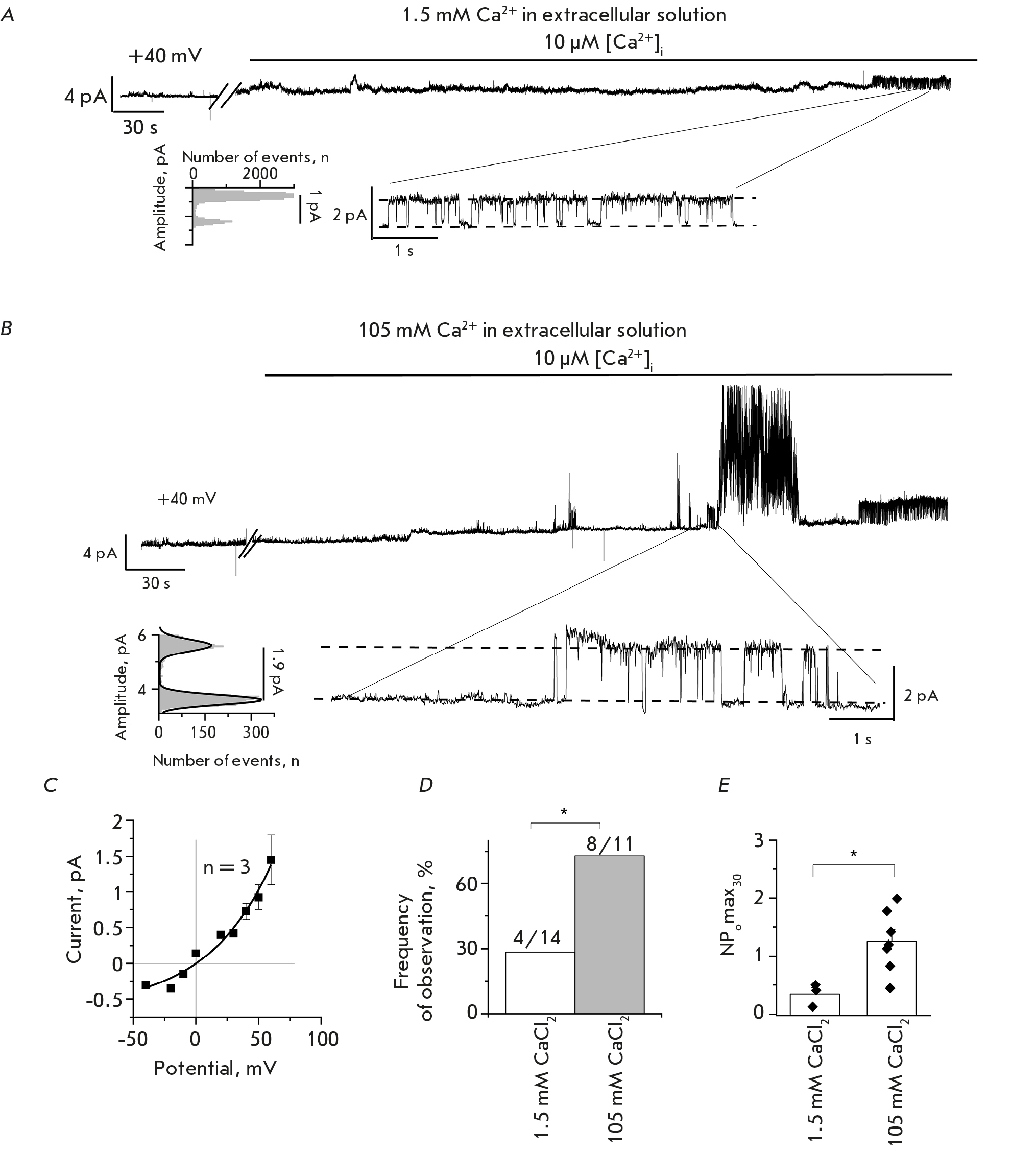 Fig. 1. Activity of endogenous ANO6 CaCCs induced by application of 10 µM [Ca2+]i to the intracellular side of the plasma membrane in the inside-out configuration in the presence of 1.5 mM or 105 mM Ca2+ in the extracellular solution. Representative fragments of the recordings are shown, with expanded current traces and corresponding amplitude histograms at the bottom. (A) A fragment of the current recording through endogenous ANO6 CaCCs activated by application of 10 µM [Ca2+]i with 1.5 mM Ca2+ in the extracellular solution. (B) A fragment of the current recording through endogenous ANO6 CaCCs activated by application of 10 µM [Ca2+]i with 105 mM Ca2+ in the extracellular solution. (C) The average current–voltage relationship of endogenous ANO6 CaCCs in the presence of 1.5 mM Ca2+ in the extracellular solution. (D) The frequency of experiment observations with endogenous ANO6 CaCCs activated by application of 10 µM [Ca2+]i with 1.5 mM or 105 mM Ca2+ in the extracellular solution (p < 0.05). (E) NPomax30 of endogenous ANO6 CaCCs activated by application of 10 µM [Ca2+]i in the extracellular solutions of 1.5 mM and 105 mM Ca2+ (p < 0.05)