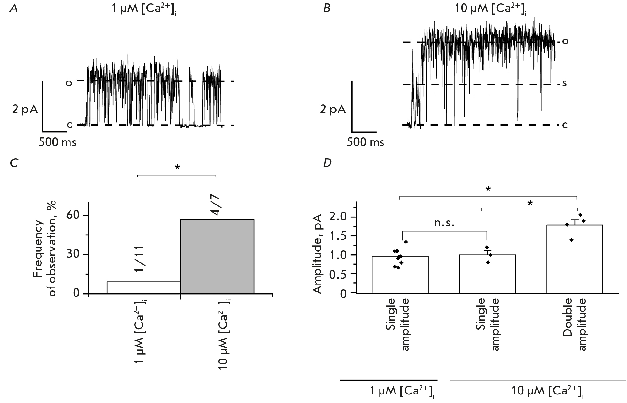 Fig. 3. Amplitude of endogenous CaCC at 1 and 10 µM [Ca2+]i. The extracellular solution contained 105 mM CaCl2. The channels were activated by application of a solution with 1 or 10 µM [Ca2+]i. (A) A fragment of current recording through endogenous single-amplitude CaCC activated by application of 1 µM [Ca2+]i. c is the closed state of the channel; o is the open state of the channel. (B) A fragment of current recording through endogenous double amplitude CaCC activated by application of 10 µM [Ca2+]i. c is the closed state of the channel; o is the open state of the channel; and s is the substate. (C) The frequency of observation of endogenous CaCC ANO6 with double amplitude activated by 1 µM [Ca2+]i (white) or 10 µM [Ca2+]i (gray), p < 0.05. (D) The amplitude of endogenous ANO6 channels activated by 1 or 10 µM [Ca2+]i (p < 0.05)