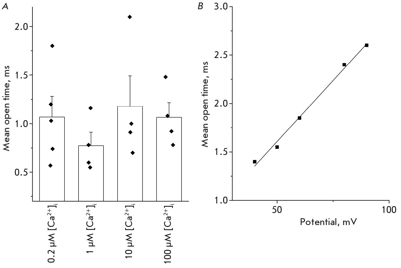 Fig. 4. Effect of [Ca2+]i and the membrane potential on the open state lifetime of endogenous ANO6 channels in HEK293T cells. For the analysis, experiments were conducted in an inside-out configuration with 105 mM CaCl2 in the extracellular solution. (A) The average open state lifetime of endogenous CaCCs at +40 mV at various intracellular calcium concentrations (p > 0.05). (B) The dependence of the open state lifetime of endogenous CaCCs on the membrane potential at an intracellular calcium concentration of 100 µM (the data from a representative experiment are presented)