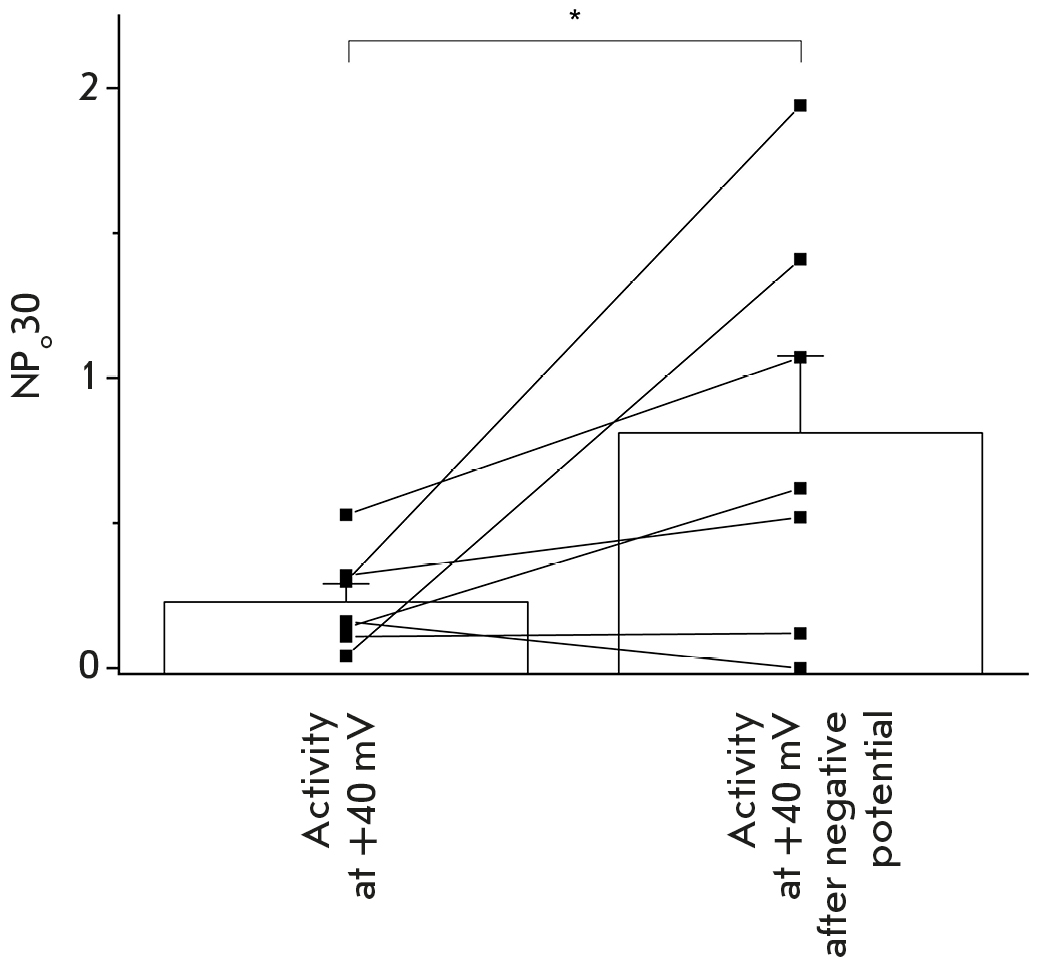 We have found that the activity of ANO6 channels at a potential of +40 mV increases after transient membrane potential switching to a negative potential and back to +40 mV. The experimental scheme is presented below: channels were activated by adding 1 µM [Ca2+]i to the intracellular side of the membrane at a potential of +40 mV; then the potential was maintained negative during 30 s, and a +40 mV voltage was reapplied. Potential switching back to +40 mV increased activity, on average from 0.23 ± 0.06 to 0.81 ± 0.26 (n = 7, p < 0.05, Fig. 5). This effect was not observed at higher calcium concentrations (10 or 100 µM): presumably, the channels had been induced to the maximum extent and activity could not be increased any further.