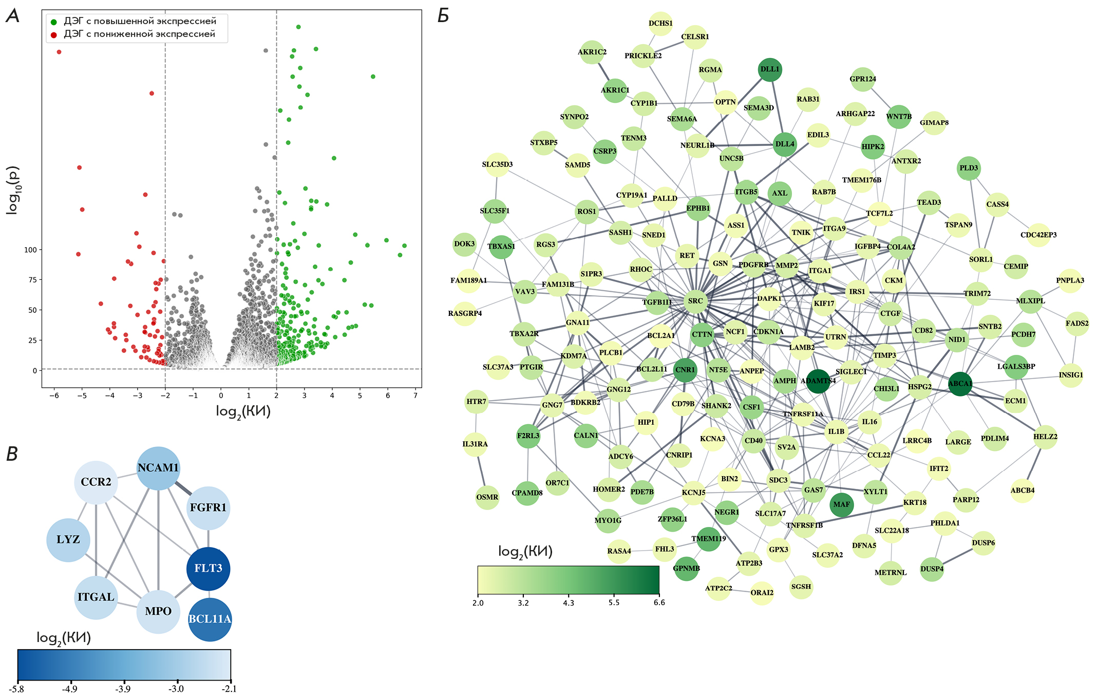 In the PPI network clusters shown in Fig. 4, the five most repetitive genes were selected with the highest rank value, namely CSF1, which encodes a macrophage colonystimulating factor (M-CSF); PDGFRB, encoding the platelet growth factor receptor (PDGF); MMP2, encoding matrix metalloproteinase 2; SRC, encoding non-receptor tyrosine kinase SRC; and IL1B encoding interleukin1ß (IL-1ß). The role of the products of identifiable hub genes is well known in myeloid maturation, proinflammatory activation of cells, and progression of AML. M-CSF is the main regulator of macrophage differentiation and a promising target for AML therapy [42, 43]. The PDGF receptor has been shown to participate in the myeloid maturation of leukemic cells, activation of proto-oncogenic tyrosine kinases of the SRC family, and maintenance of the viability and proliferation of tumor cells [44–46]. SRC tyrosine kinases are the specific signaling integrators necessary for normal hematopoiesis and progression of acute leukemia [47, 48]. The role of IL-1β in the development of inflammatory processes and malignant neoplasms is well known. For example, chronic inflammation mediated by IL-1β is often associated with the emergence and progression of malignant tumors, as well as the direct regulation of myeloid cell differentiation and the signaling pathways that mediate the survival of leukemic cells [49–51]. Matrix metalloproteinases are involved in the migration of myeloid cells induced by an inflammation, and their suppression significantly reduces the viability and proliferation of AML cells [52, 53].