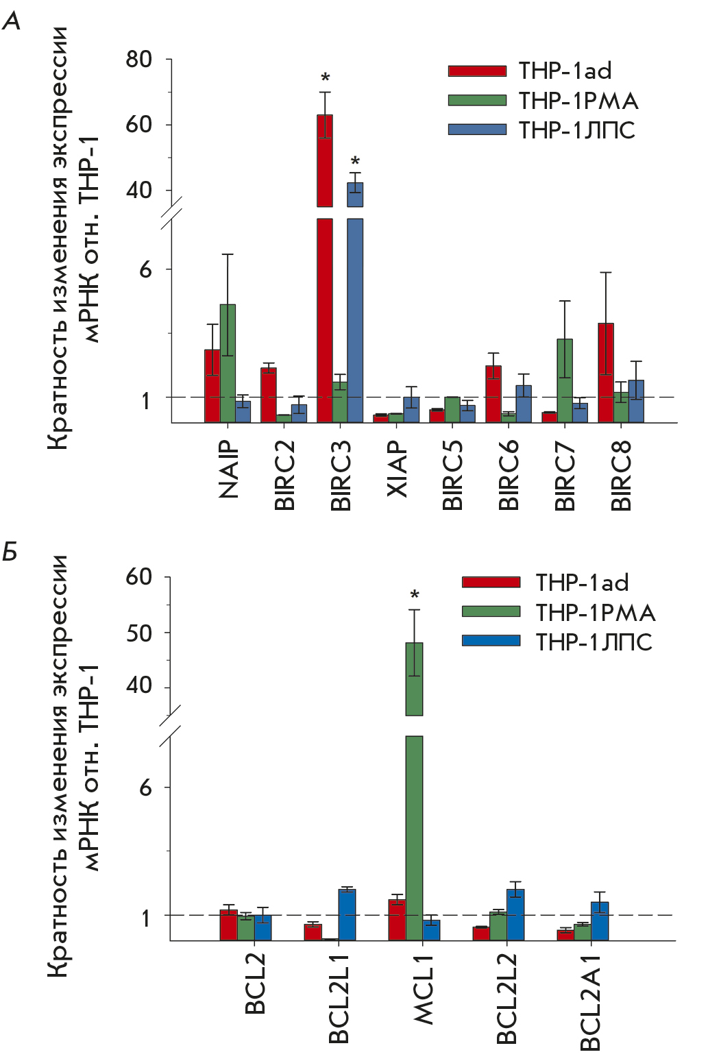Furthermore, expression of all the anti-apoptotic members of the IAPs and BCL-2 family in macrophage-like THP-1ad clones and in parent THP-1 cells was revealed by quantitative reverse transcription PCR. Additionally, expression of these genes was analyzed in THP-1 cells treated with forbol ether (THP-1PMA) and LPS (THP-1LPS), known inducers of macrophage differentiation and activation of proinflammatory signaling pathways, respectively [56, 57].