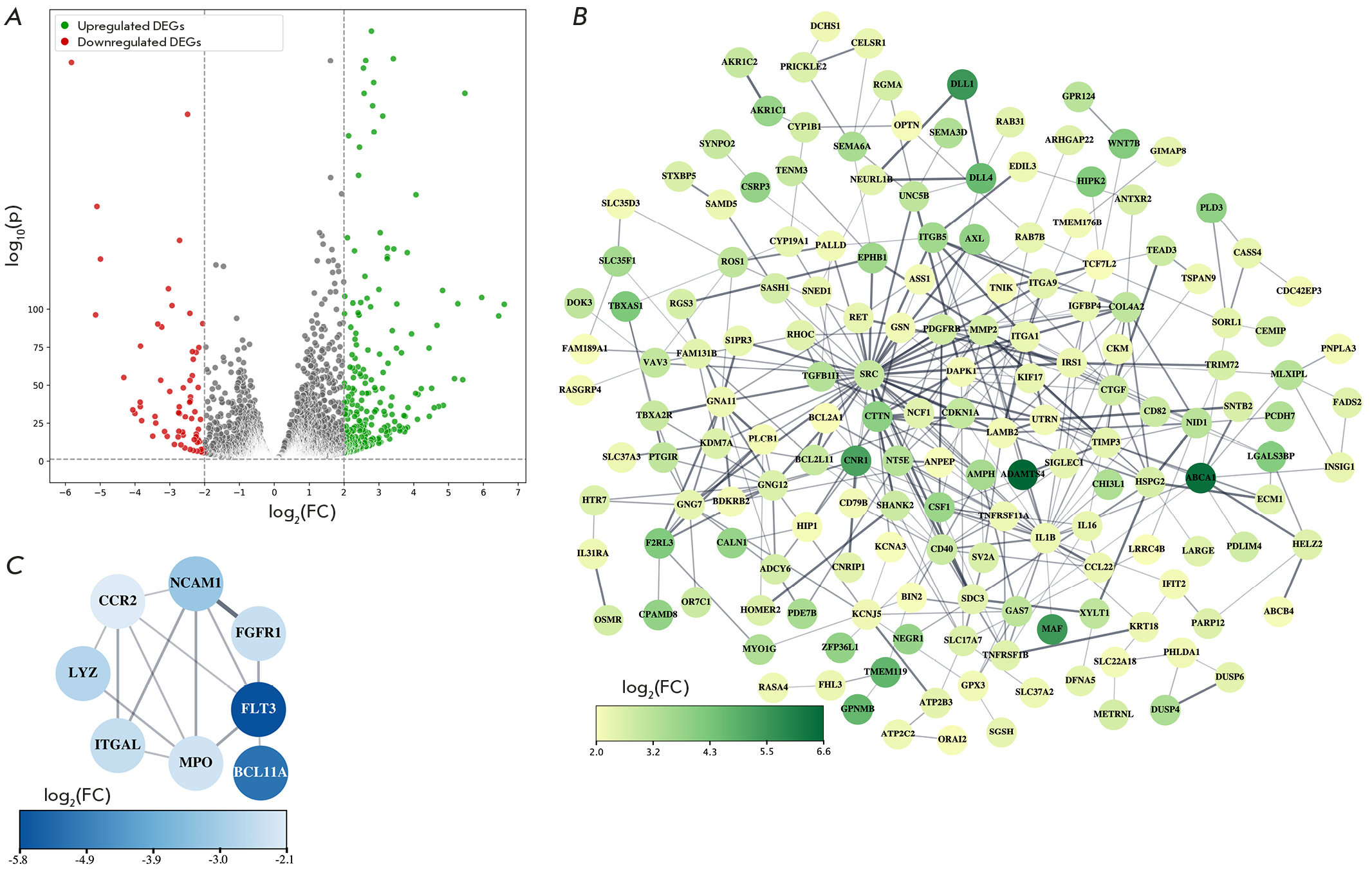 Fig. 3. A diagram illustrating the distribution of DEGs in THP-1ad cells compared to the parent THP-1 cells (A). The PPI networks of DEGs products in THP-1ad cells are shown. The DEGs with increased expression are highlighted in green (B), whereas those with decreased expression are highlighted in blue (C)