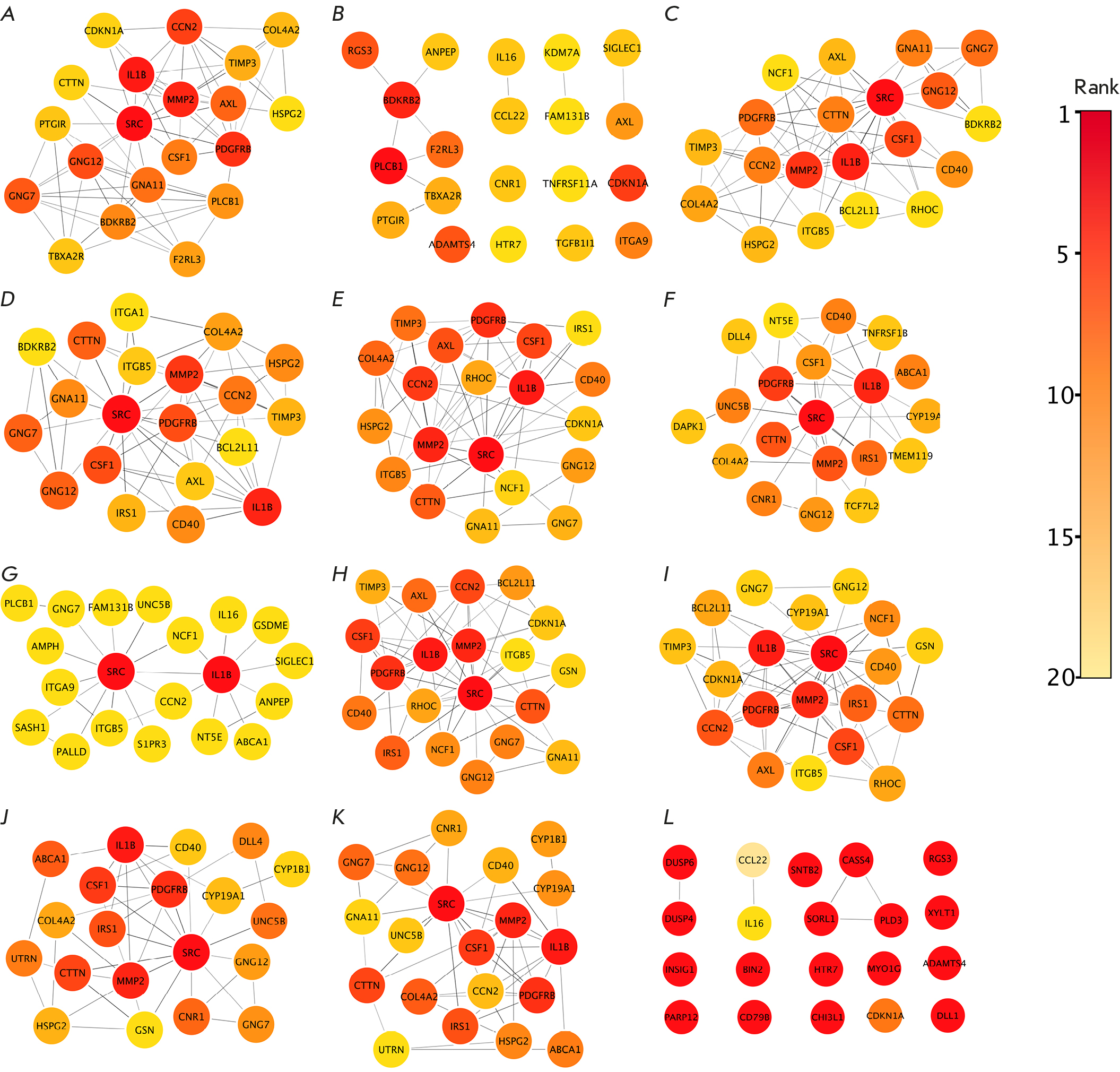 Fig. 4. Clustering of the PPI network of genes with increased expression using the cytoHubba module algorithms: MCC (A), DMNC (B), MNC (C), Degree (D), EPC (E), BottleNeck (F), EcCentricity (G), Closeness (H), Radiality (I), Betweenness (J), Stress (K), and ClusteringCoefficient (L)