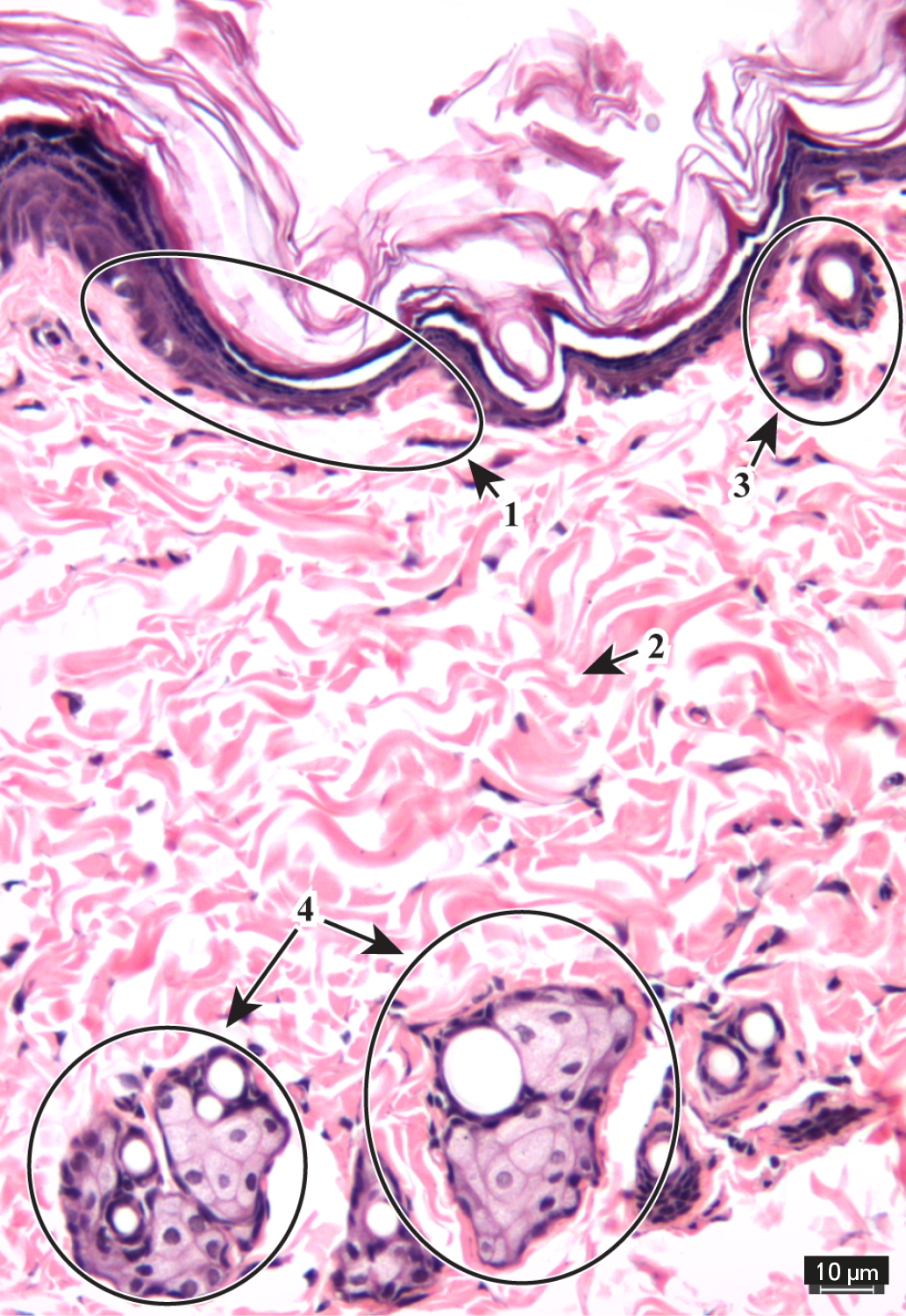 Fig. 2. Micrograph of intact animal skin. Hematoxylin and eosin stain. ×20 objective. 1 – epidermis, 2 – dermis,3 – hair follicles, 4 – sebaceous glands